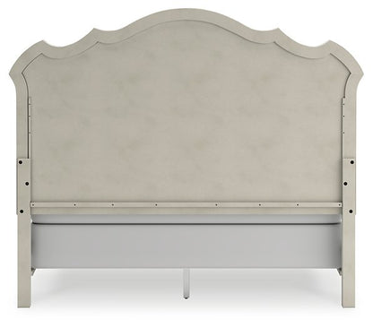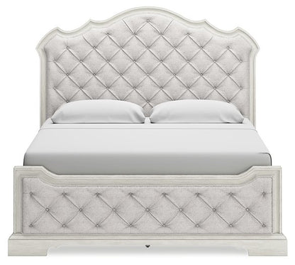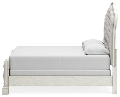 Add a touch of romance to your home with this queen upholstered bed. The antiqued white painted finish and serpentine-shaped silhouette details are the picture of easy elegance. Indulge your love of luxury with decadent button-tufted cushioning from head to toe.| Full Dimension | 68W x 90.25D x 71H |