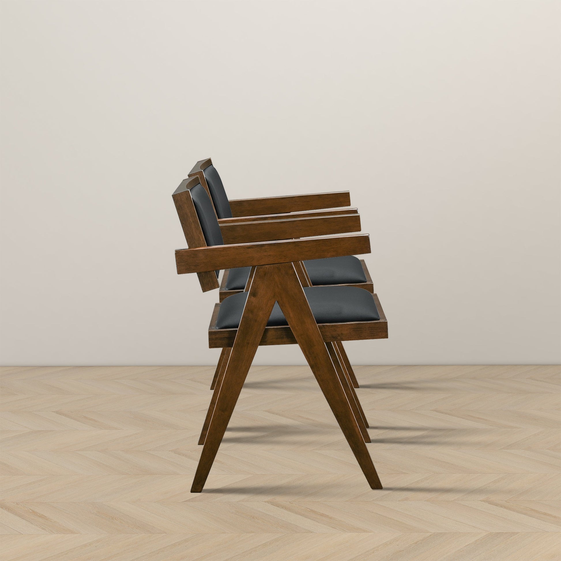 Mid Century Modern Design, Set of 2 Solid Wood Dining Chairs, Black Vegan Leather Upholstery, Arm Support for Better Dining and Work Experience