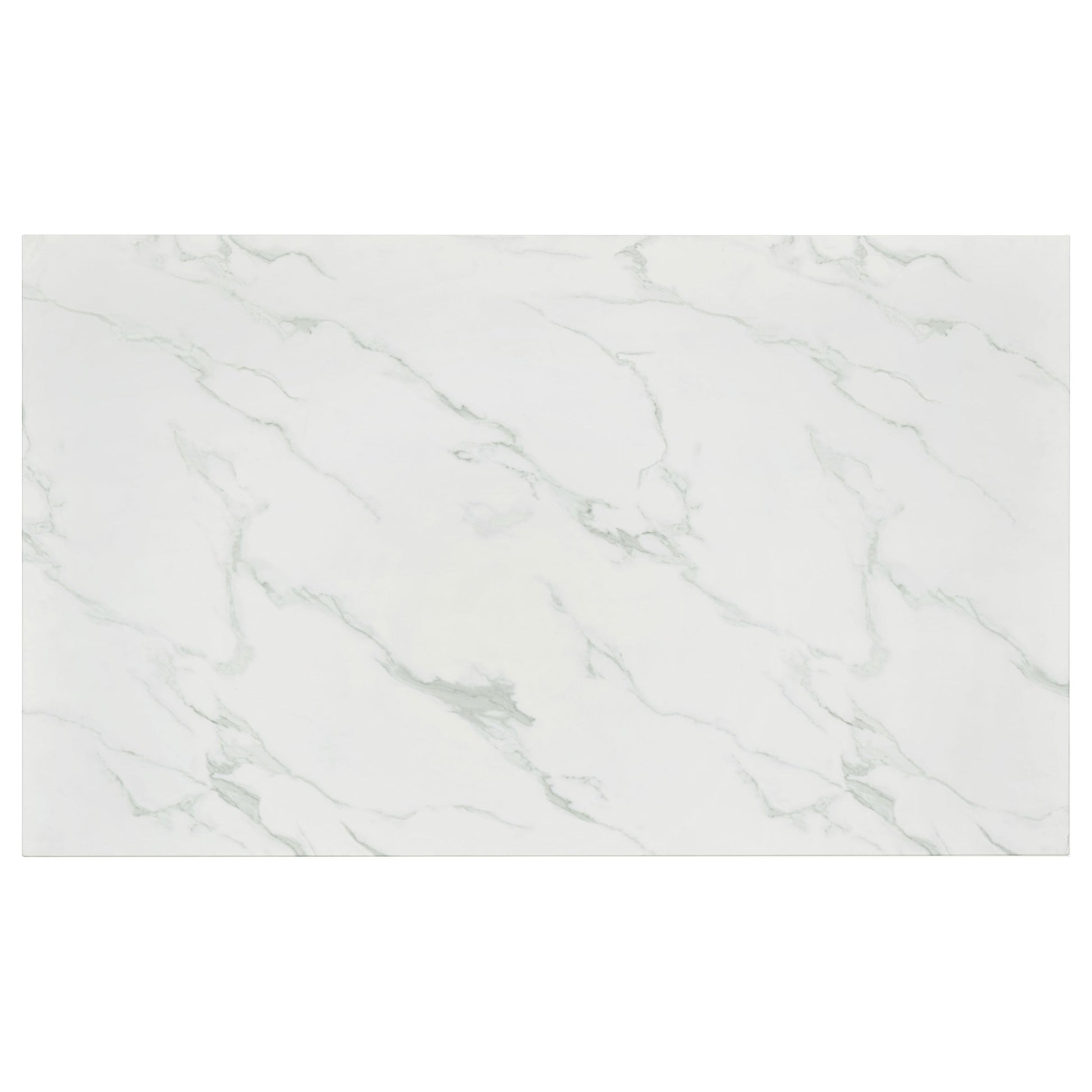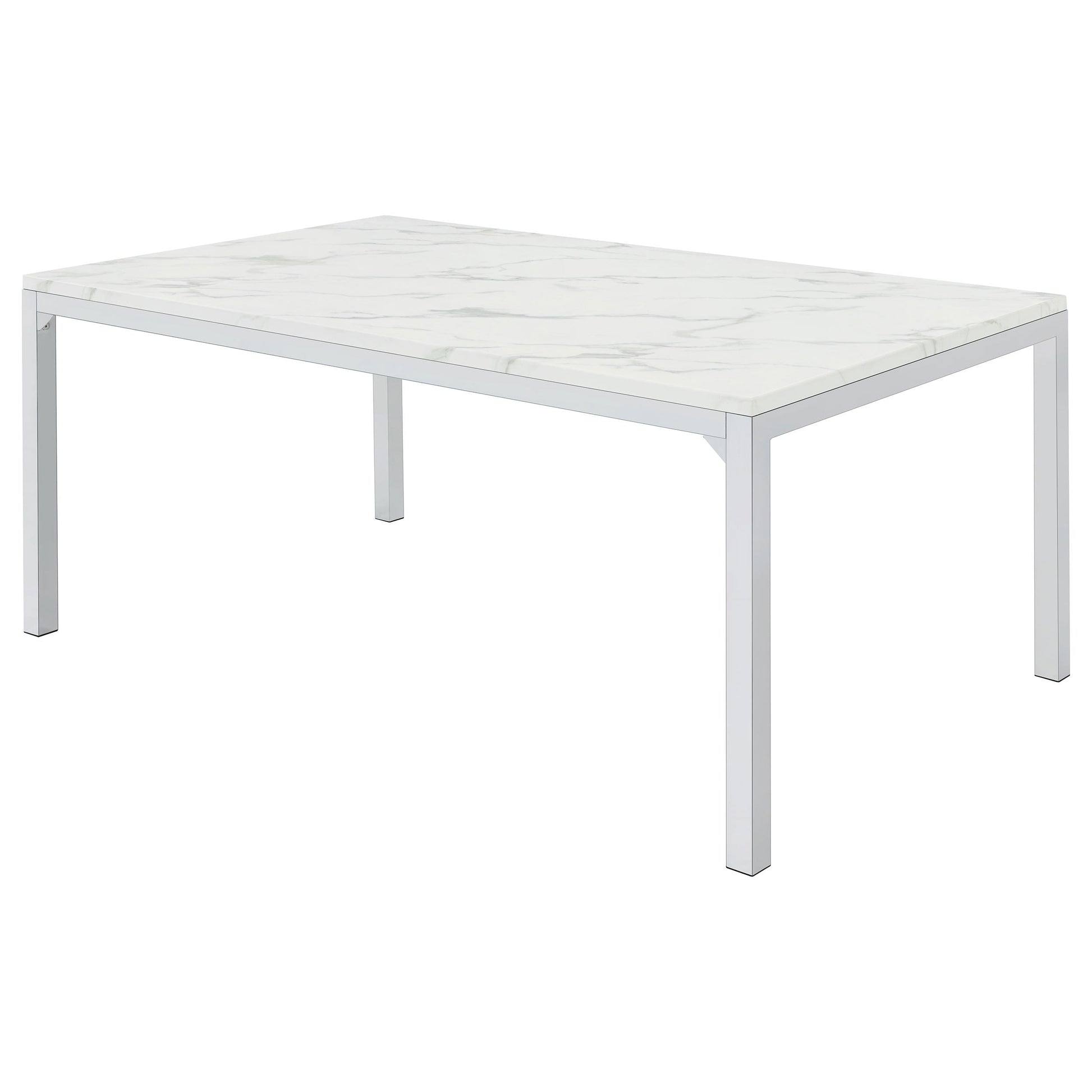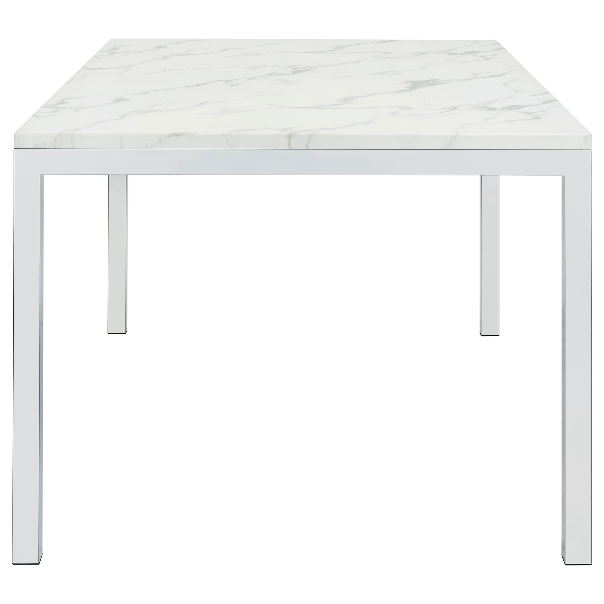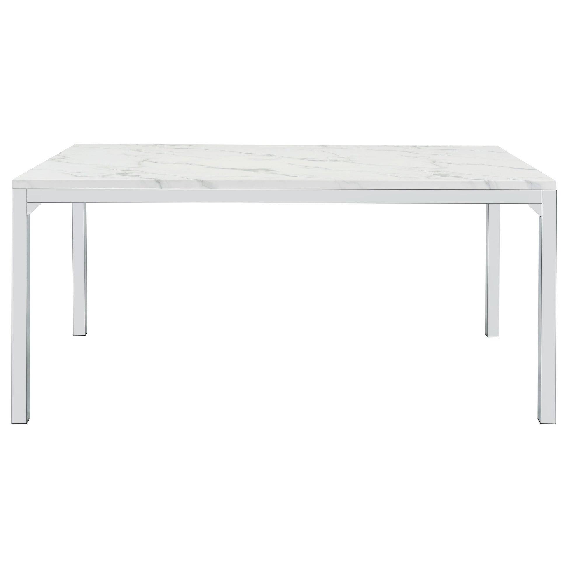 Dress up a dining room with striking, modern opulence. This gorgeous, contemporary dining table flaunts a smooth, white, marble top for a luxurious design that's sure to impress. The table base is made with top-quality metal in a gleaming chrome finish that shines in the light. From everyday dinners to elaborate feasts, the rectangular surface provides all the space you need for family dining enjoyment. Surround this modern table with your favorite chairs to complete a formal dining room in style.