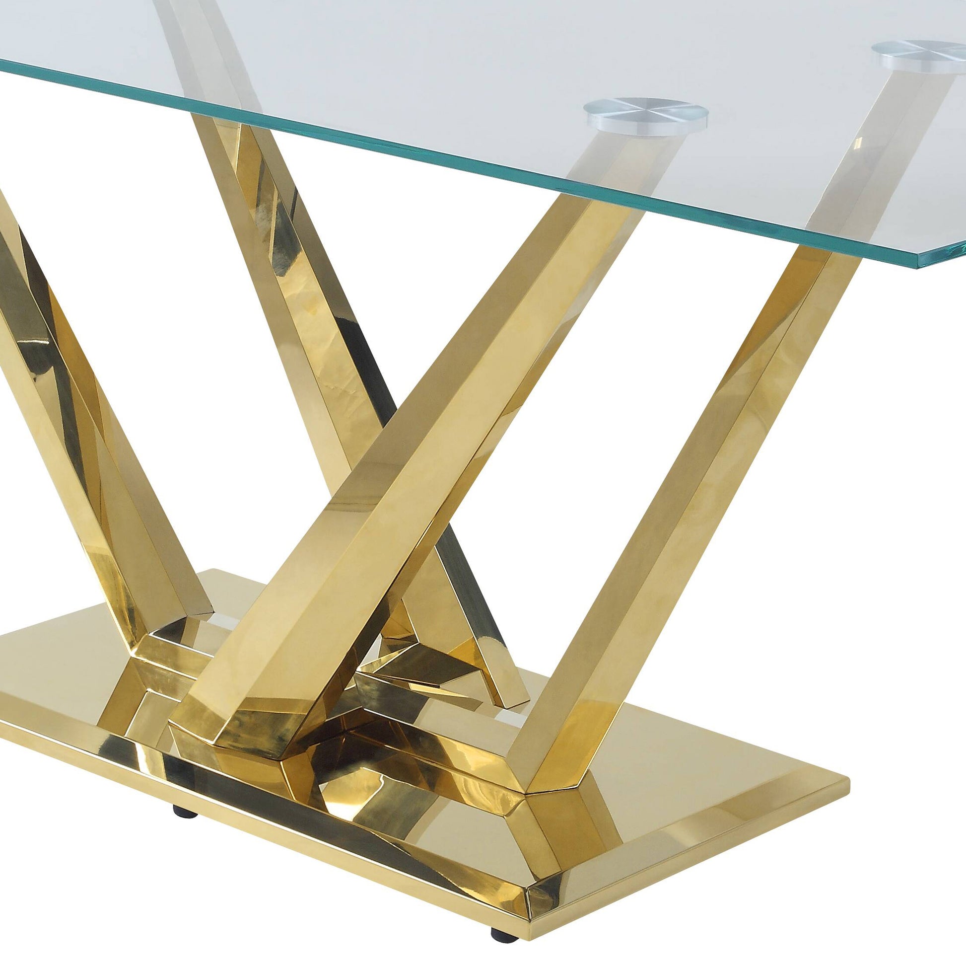 The Barnard dining set is ideal for hosting dinner parties and impressing your guests. Boasting a clear tempered glass top to let the gleaming stainless steel gold base be the star of the show. The dining chairs are upholstered in a beautiful velvet fabric to add more glamour to the set, the gold metal legs coordinate seamlessly with the table.