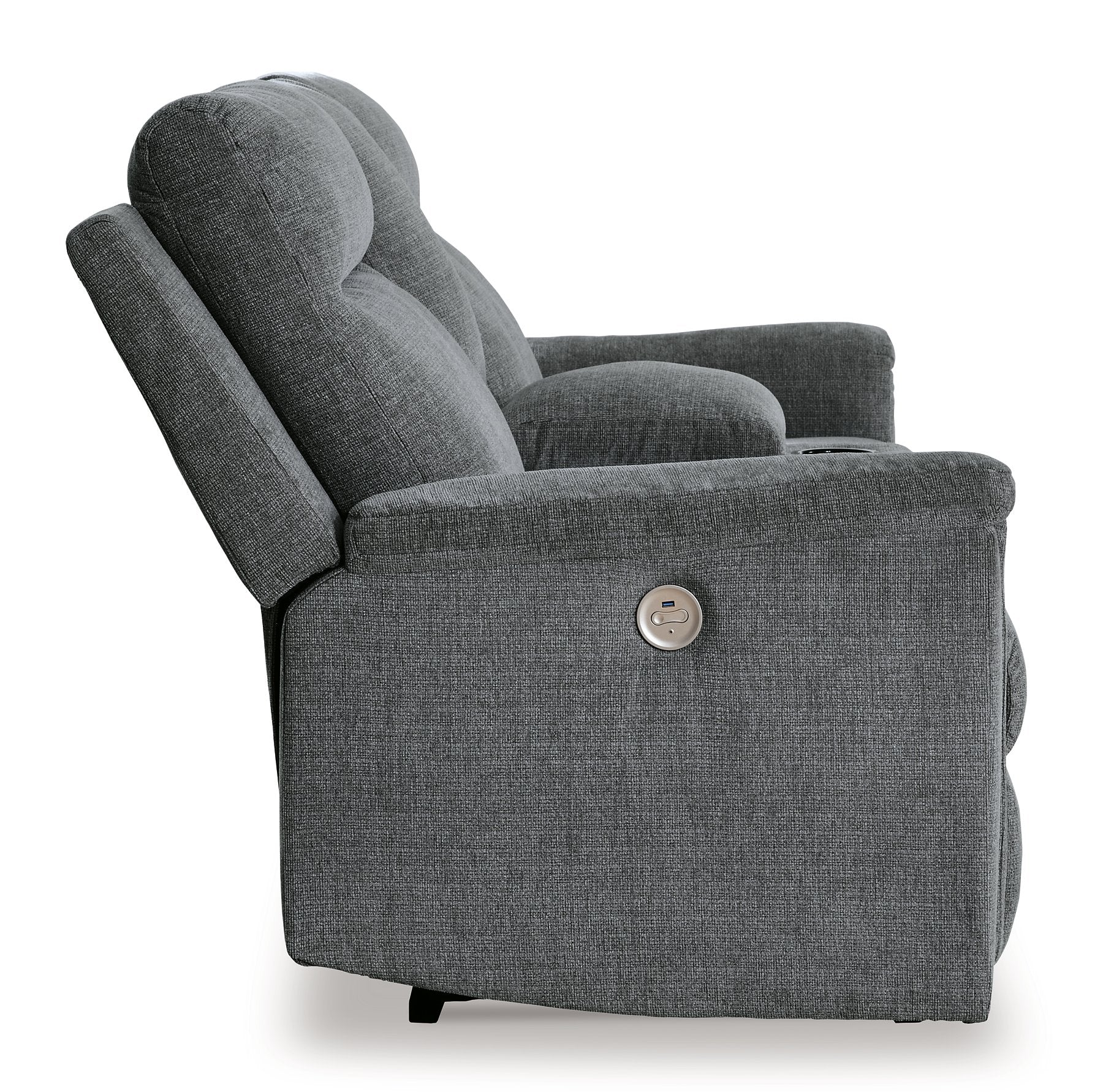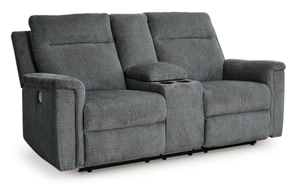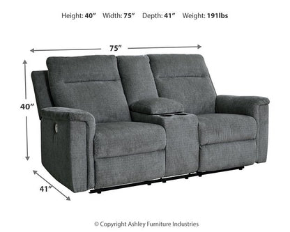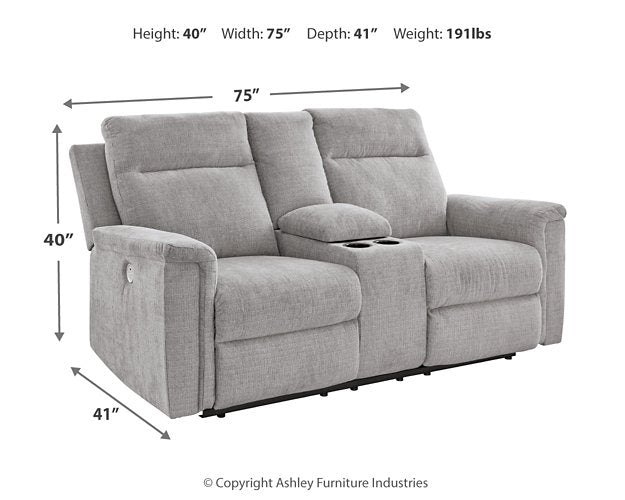 The ability to go from fully upright to relaxed and stretched out, all at the touch of a button, awaits. A beautiful blend of plush upholstery and casual style, this power reclining loveseat with console invites you to sink into ultimate comfort. Easily tuck away remotes or gaming controllers and keep drinks close by with its handy console. Whether you're hosting guests or lounging alone, you’ll find it hard to leave your living room—that’s a given.| Full Dimension | 75W x 41D x 40H |