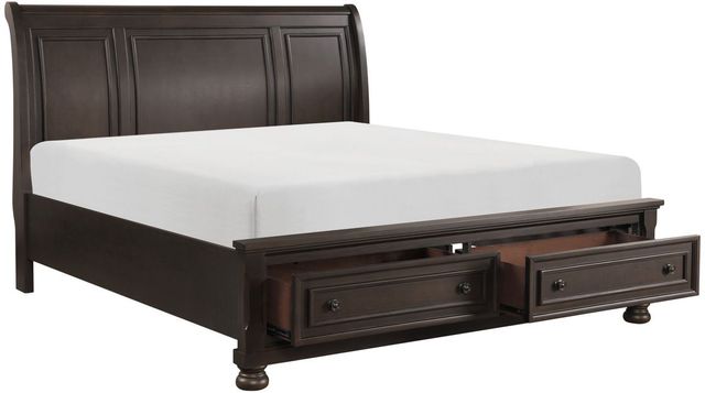 The Begonia Grayish King Storage Bed blends casual transitional styling with functional elegance, making it a versatile choice for any bedroom. Its grayish brown finish complements various decor styles, from traditional to country casual. The framed drawer fronts on the footboard, accentuated by knob hardware, add a classic touch, while the built-in storage drawers provide convenient space for extra linens or essentials. Supported by bun feet, the sleigh bed design brings a subtle decorative flair, making this bed both practical and stylish.