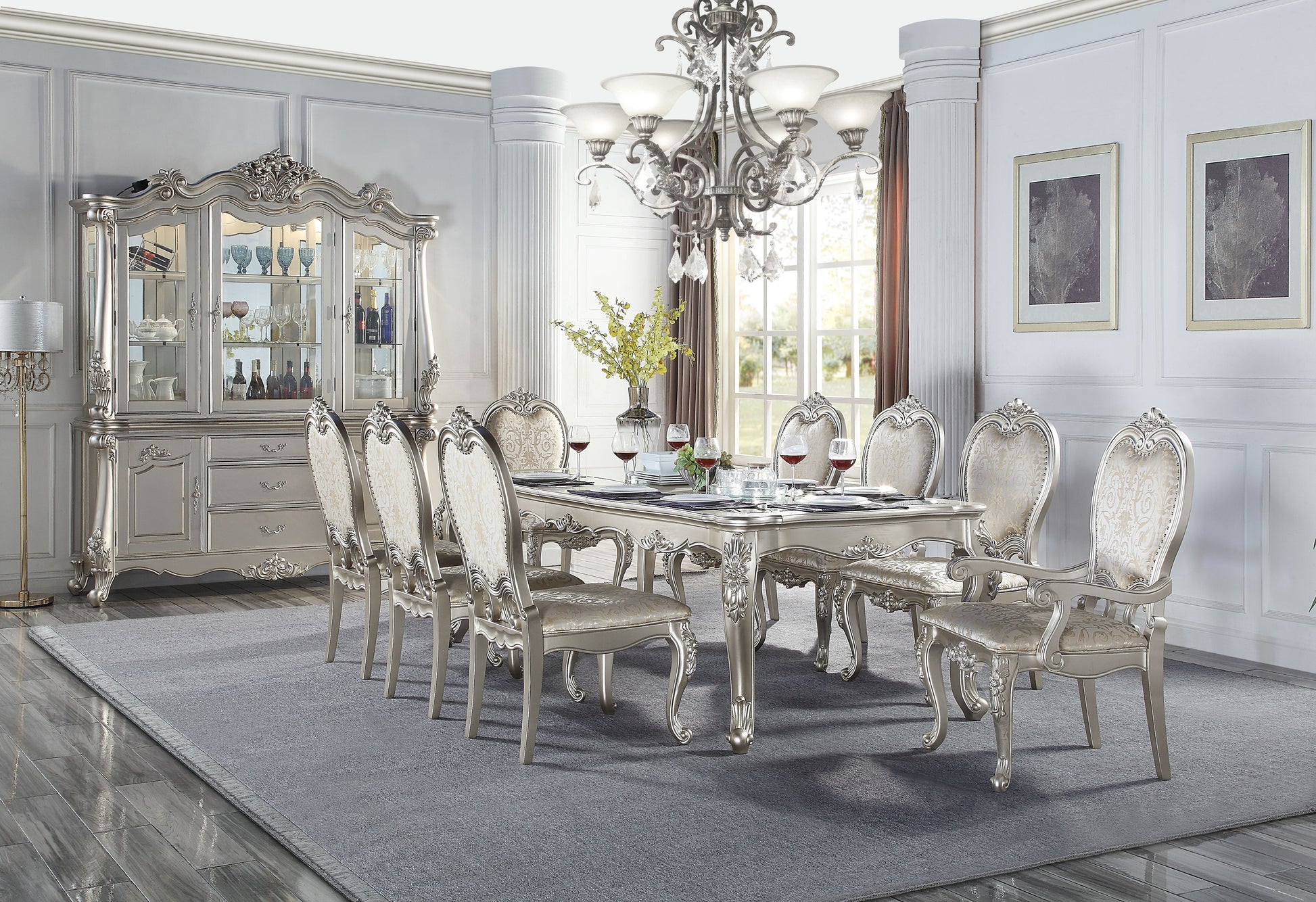 An ode to traditional glamour, the Devayne dining table brings in all the allure and charm that you are seeking for a dining table. The table features an extension leaf that allows for additional dinner guests. The champagne finish enhances the beautiful floral moldings on the legs and apron. The tabletop features mirrored panels that highlight your dinnerware.