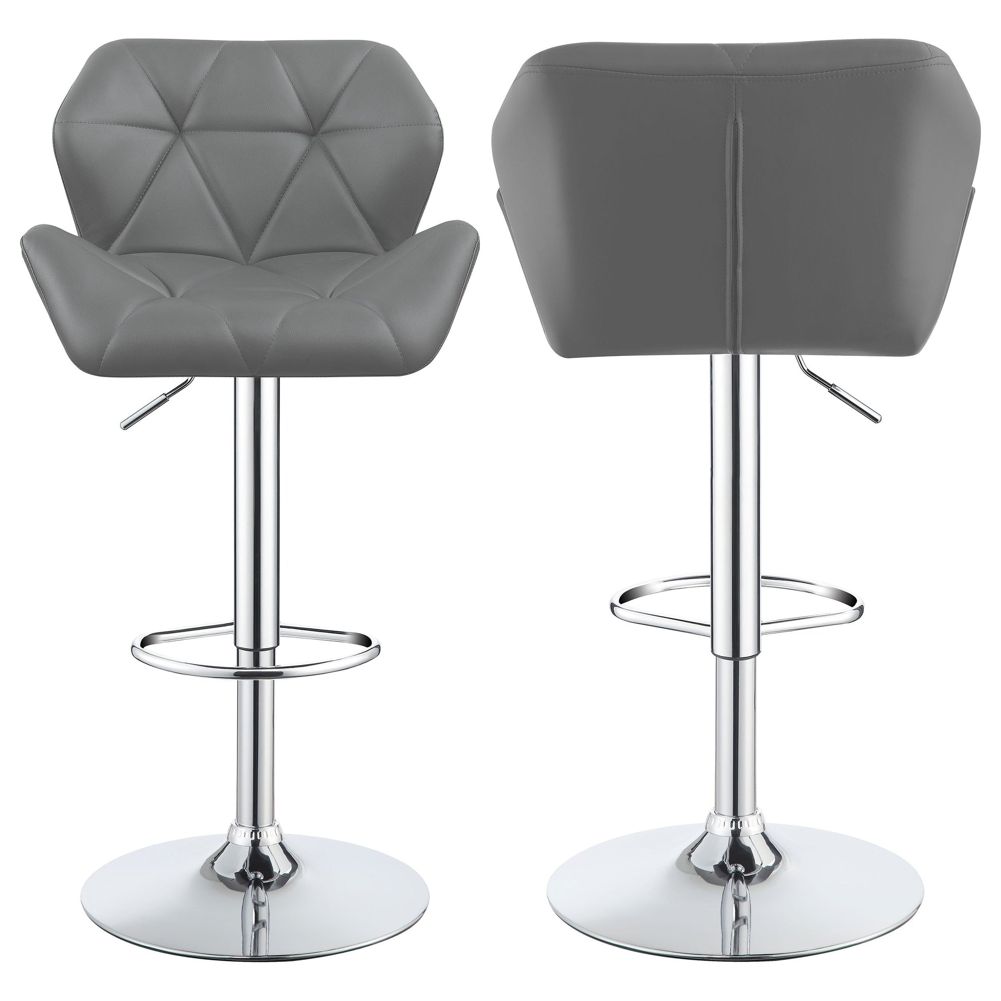 With easy adjustability and sleek, understated style, this gorgeous grey bar stool adds versatile glamour anywhere you choose to dine. Its sturdy metal base has a beautiful chrome finish and includes a round foot pedestal for added comfort. With neutral coloring and a transitional design, it complements a wide variety of decor styles and color motifs. Its height can be adjusted to fit at a bar, table, or counter for a vast array of placement options. With seemingly endless versatility, this stylish stool is ideal for dining areas of all kinds.