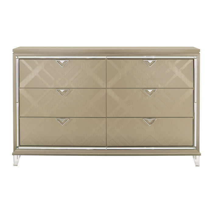 The Bijou Dresser with Hidden Jewelry Drawers is a glamorous addition to any boudoir. Mirrored framing and polished chrome hardware create a distinct geometric pattern, while the hidden jewelry box drawer provides discreet storage for your personal accessories. Perfect for modern and luxurious spaces.