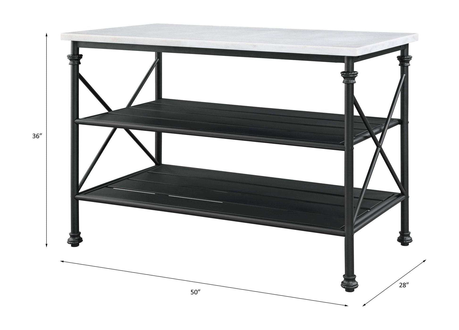 Minimalistic design paired with clean, simple color. The Brahm Kitchen Island gives off a light and airy feel to a compact cooking space. Clean-lined metal frame is topped with a artificial stone top, creating a sleek, modern silhouette that gives your kitchen an open feel. Spacious rectangular table top with two tier shelf provides more countertop space and storage. Use this stylish yet functional addition to complete your kitchen decor.