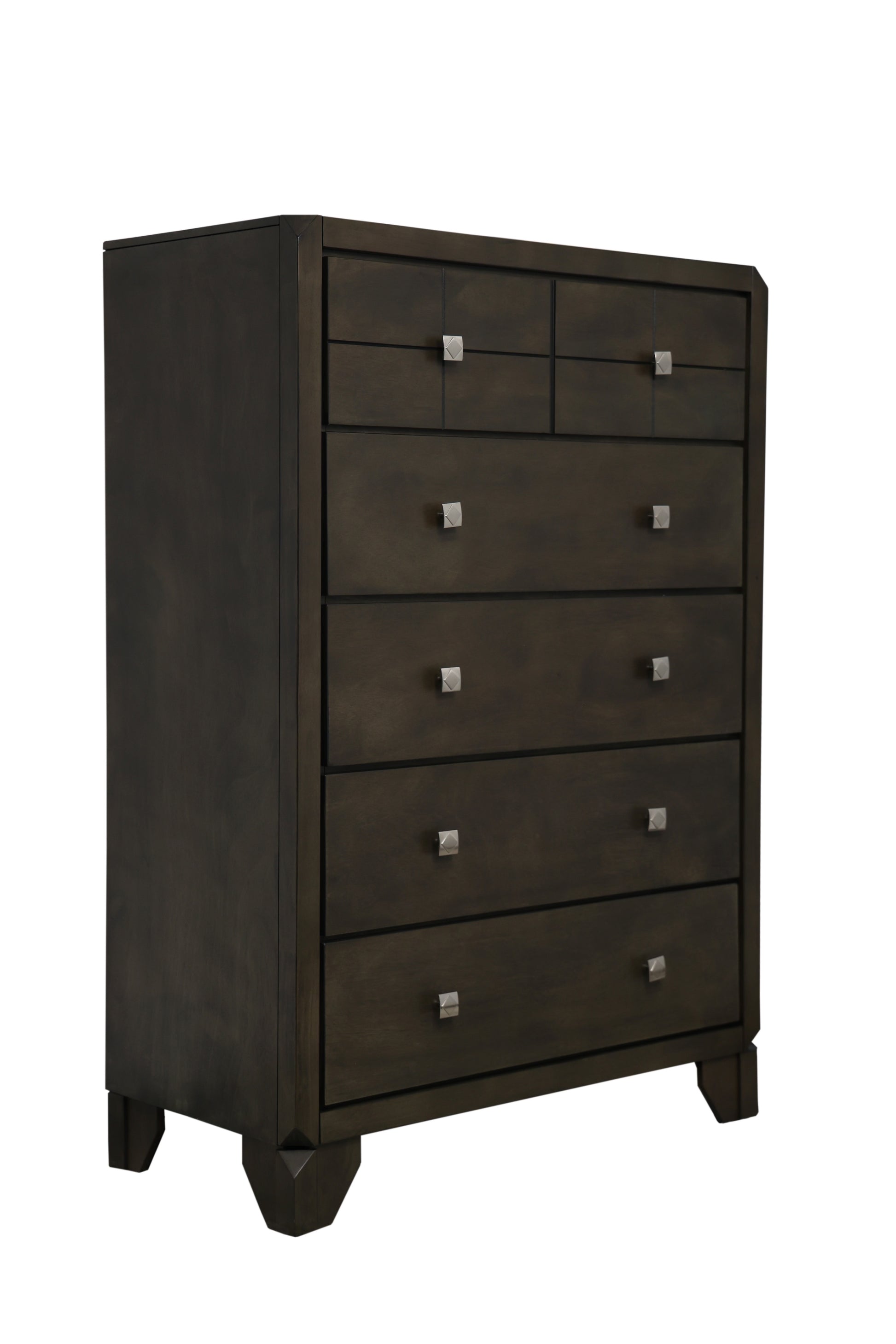 This collection of bedroom furniture will look great in any home. The stylish collection effortlessly blends traditional forms with updated details such as geometric hardware and unique corners and feet. A band with a rougher finish runs along the top of each of the pieces, breaking up the face of the case-pieces and tying the set together.