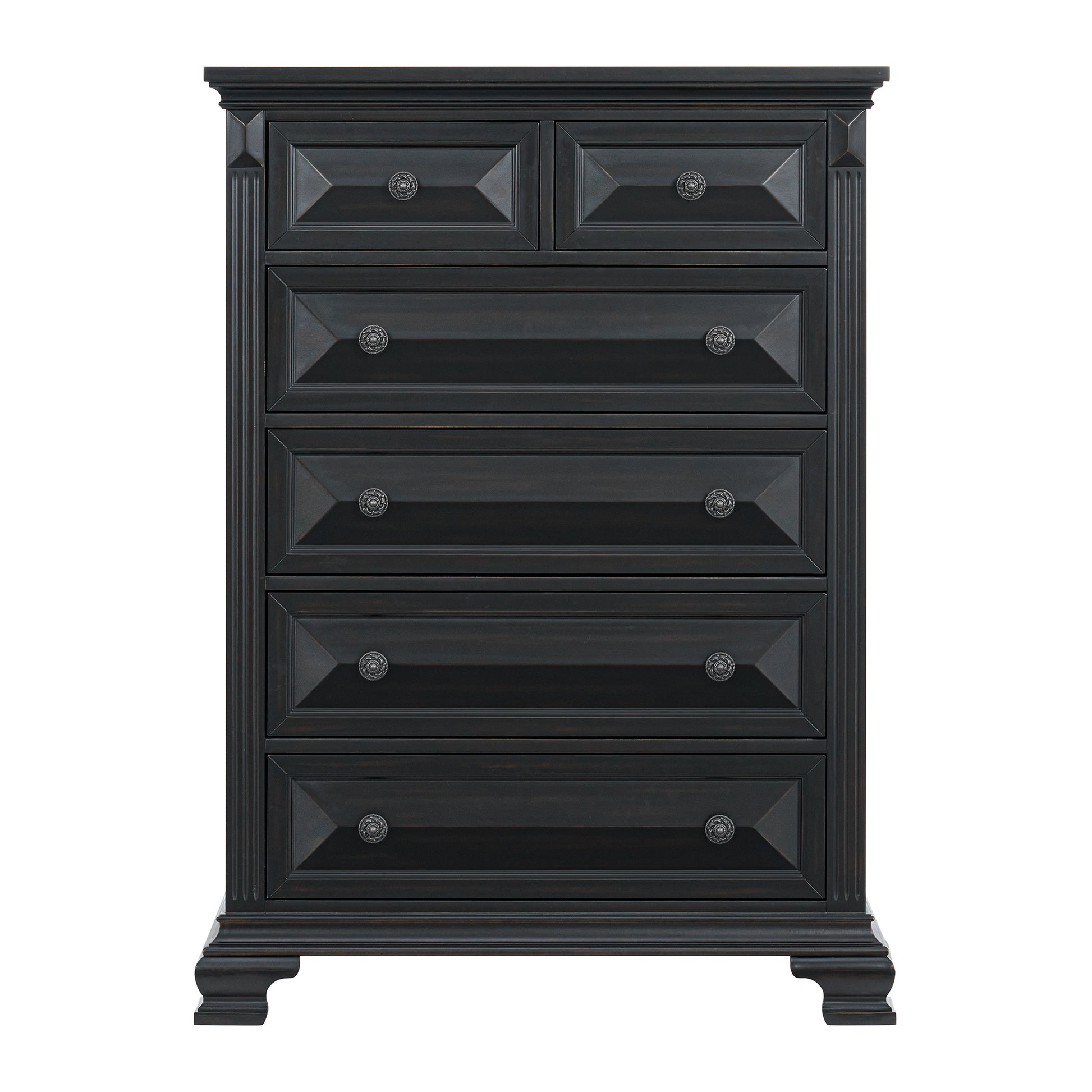 The Bridgestone 6-Drawer Chest in Black is the perfect addition to any bedroom. This case piece is designed with beautiful beveled design throughout, adding a touch of elegance to your decor. The black finish features faint distressing for a unique look, while the metal knob hardware adds a contrasting touch. The top drawers are lined with grey felt to protect delicate items, while the bottom drawer features cedar veneer for added durability. With ball bearing drawer guides and an anti-tipping kit included, this chest is as functional as it is stylish. Bring sophistication and organization to your bedroom with this piece from the Bridgestone collection.