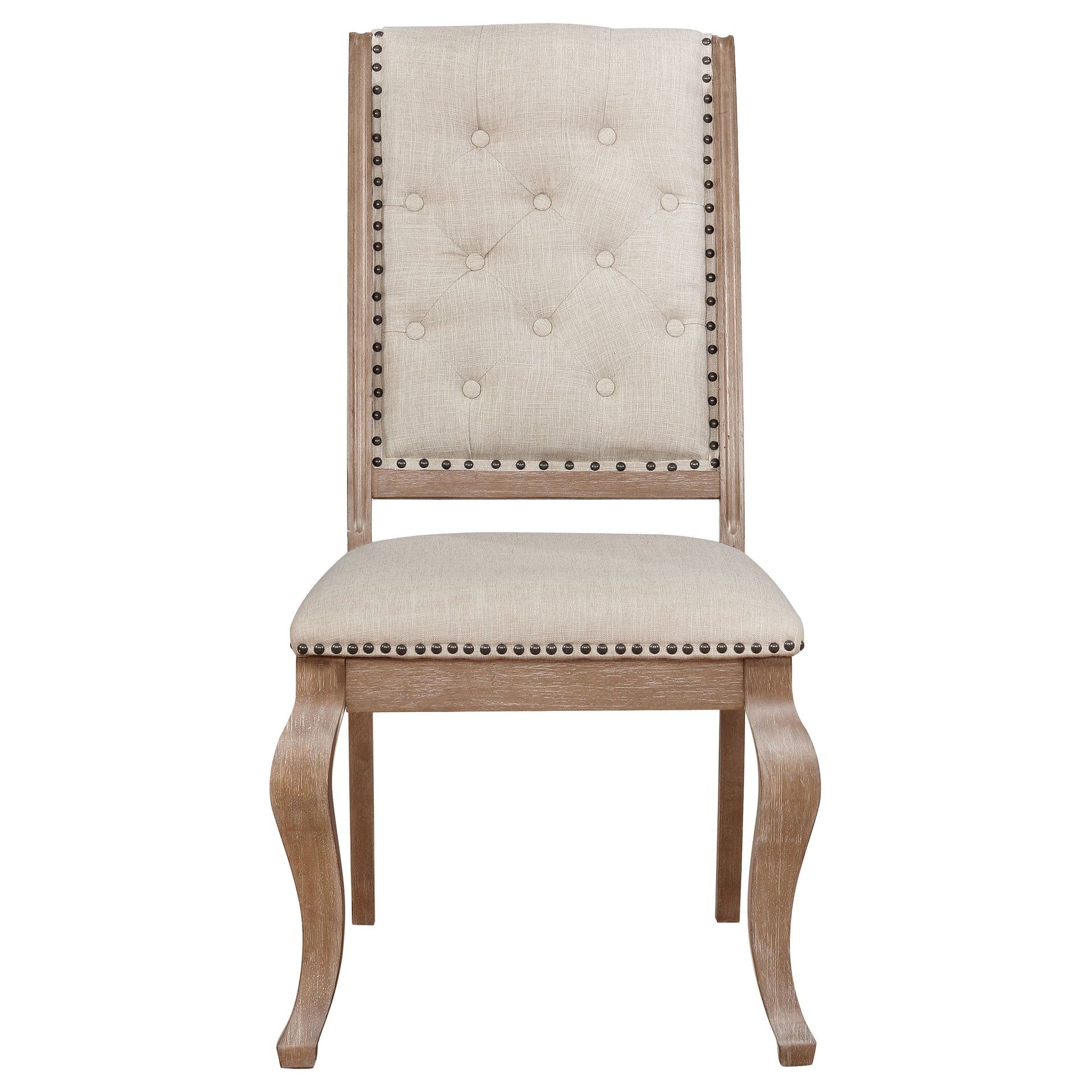 Terrifically transitional with subtle glam details comes this wood and upholstered dining set. Coming with a 20” removable extension leaf, this beautiful wood dining table is finished in a natural wood color with distressed wood grain accents. The dual pedestal base offers a final touch of traditional appeal. Find gorgeous coordinating dining chairs, upholstered in soft velvet. The dining chairs are adorned with individually applied nailhead trim with cabriole style legs for a finishing touch.
