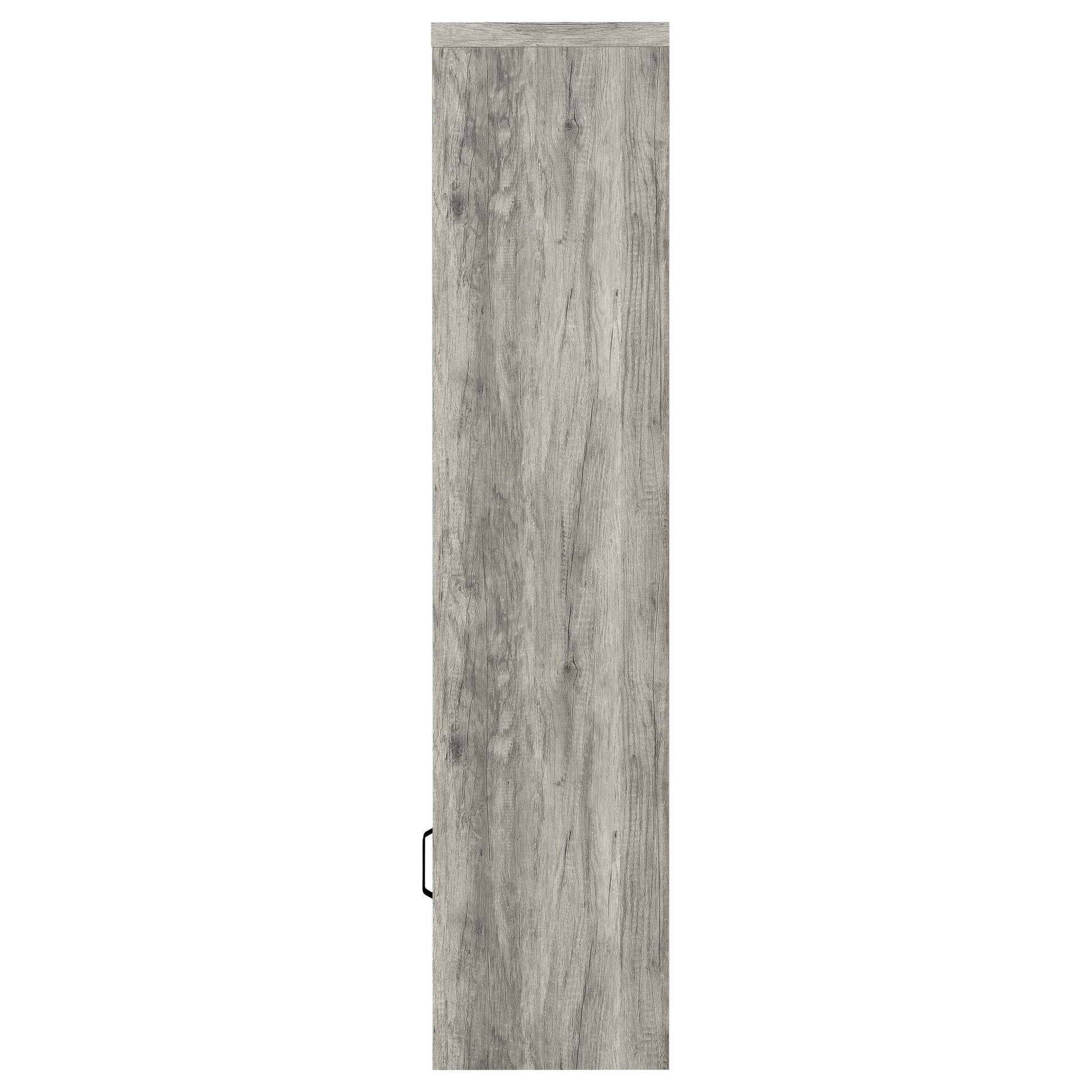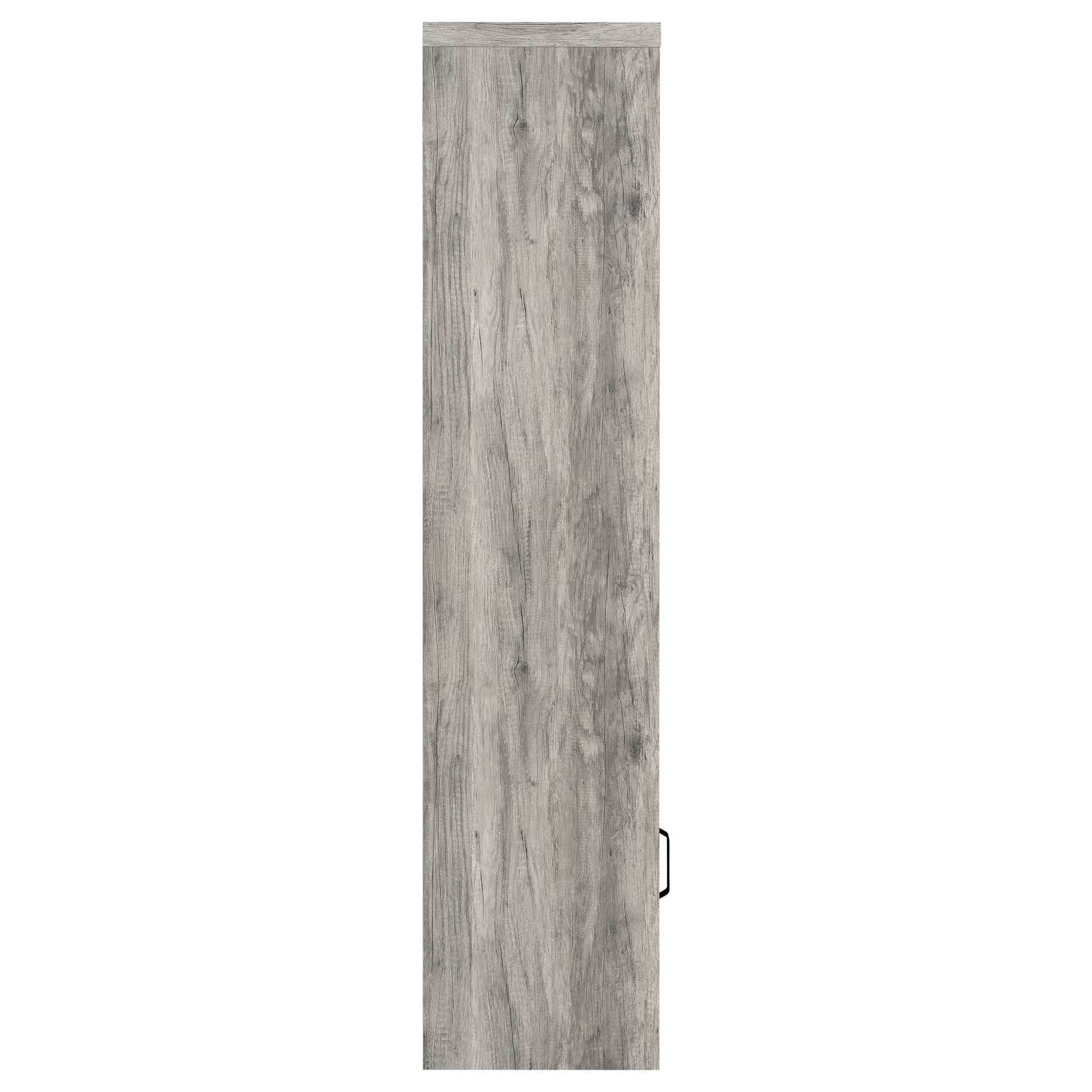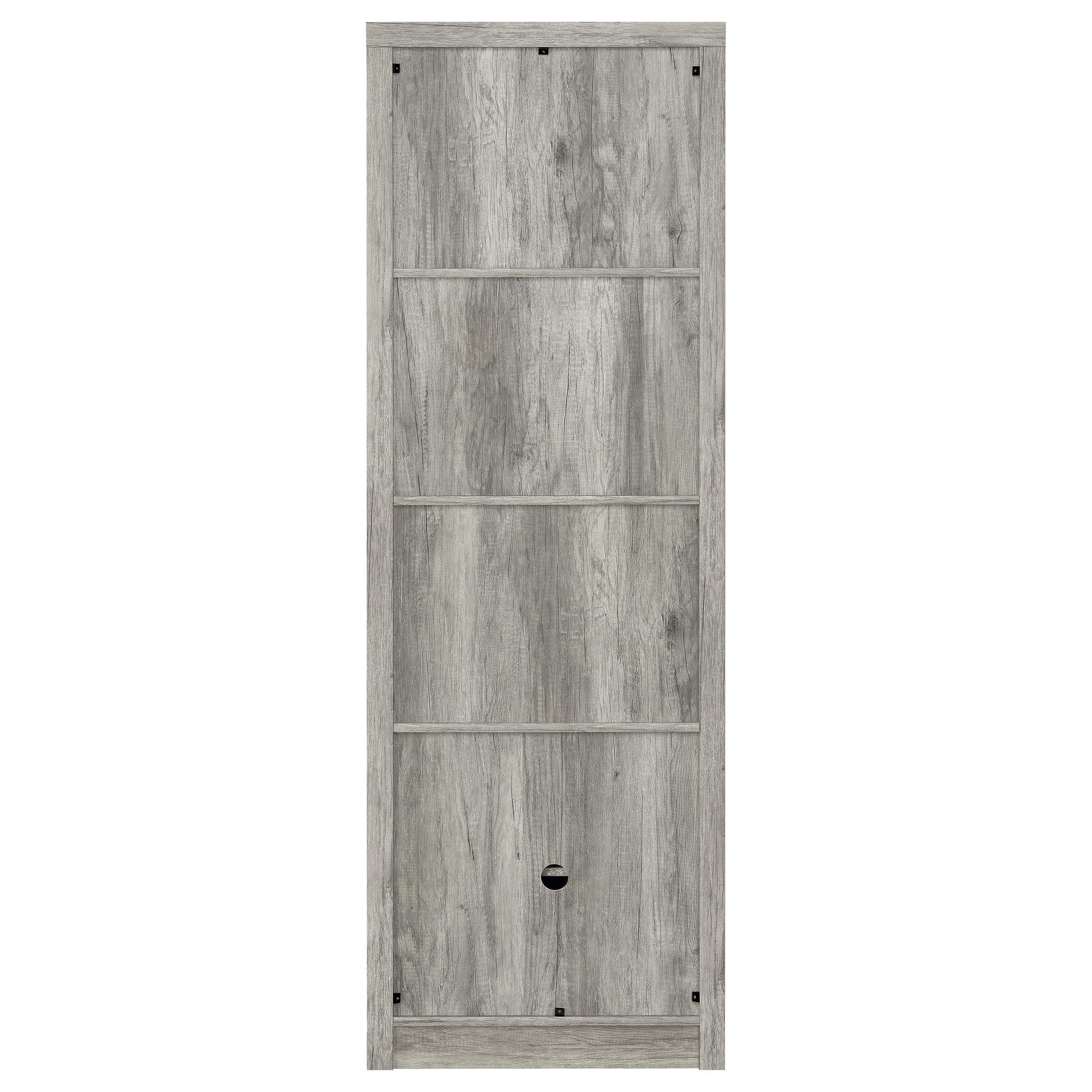 Tall and slender, this modern media tower is the perfect complement for your entertaining needs in both compact and larger spaces. Organize media, books, and implements on shelves and interior shelves, staying organized and uncluttered. Melamine construction features a distressed weathered gray finish with grain-like markings, offering rustic vibes. Find space on three fixed shelves and one adjustable shelf, all ready to separate and store gaming supplies, media, or books. A single black finished metal hardware pull offers an ideal match.