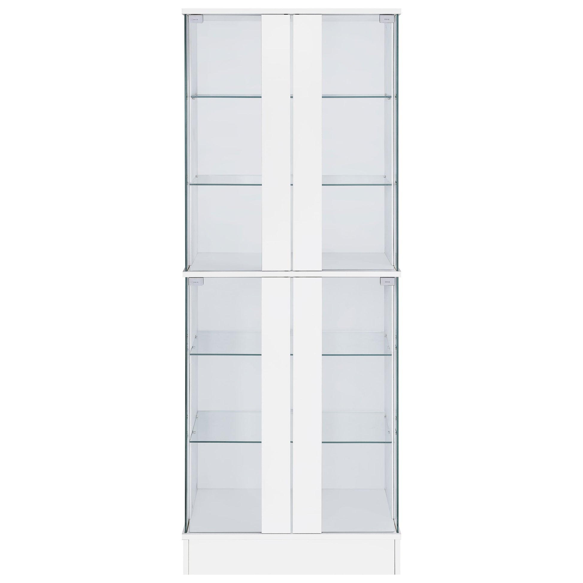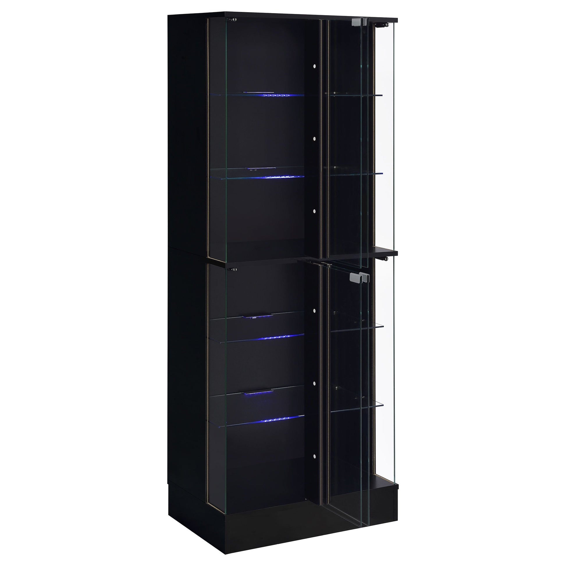 Discover sophistication and functionality fused in this sleek curio display cabinet, a stylish centerpiece for any room. The high gloss laminate on engineered wood gives a luminous sheen, complemented by clear tempered glass doors that encase six tiers of shelving. Each shelf basks in the glow of integrated LED lights, perfect for showcasing your treasures with a touch of modern elegance. The two-door design invites a clear view into your curated collection, while the robust construction promises longevity. This cabinet is not just furniture; it's a statement of refined taste and practical luxury.