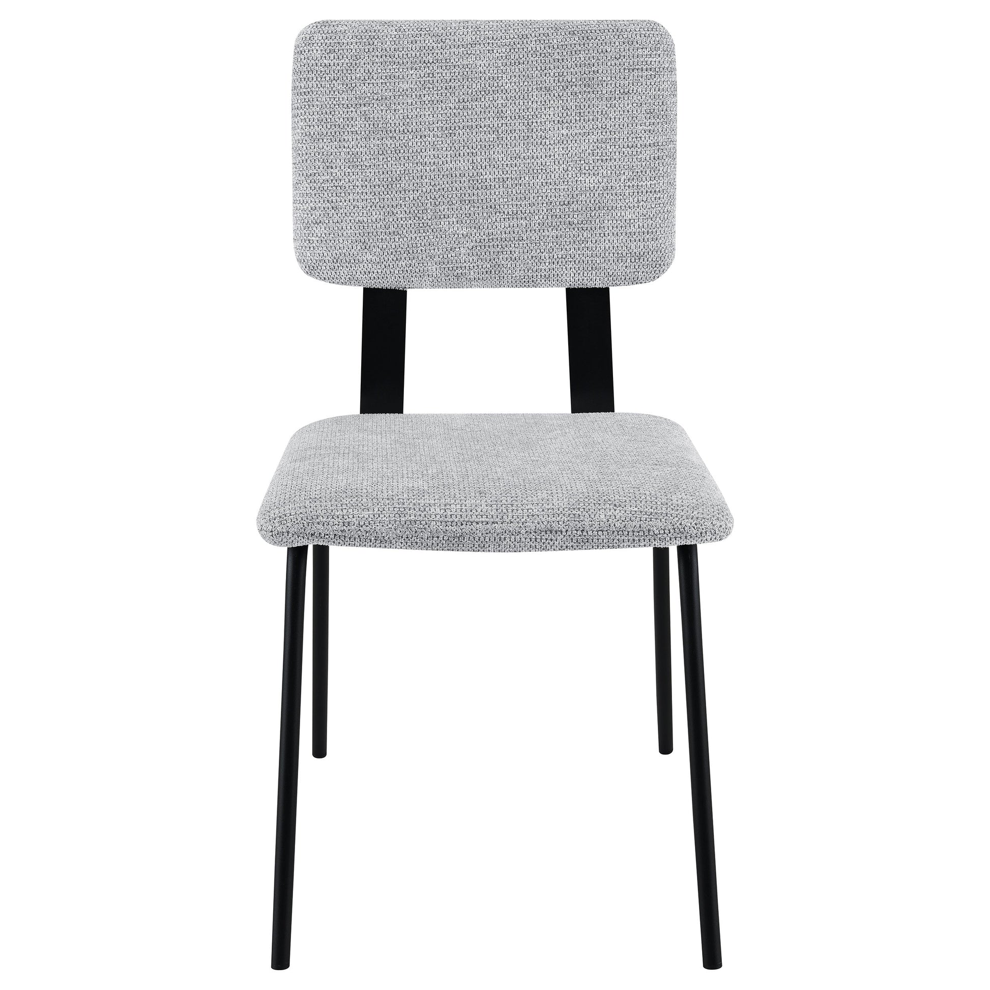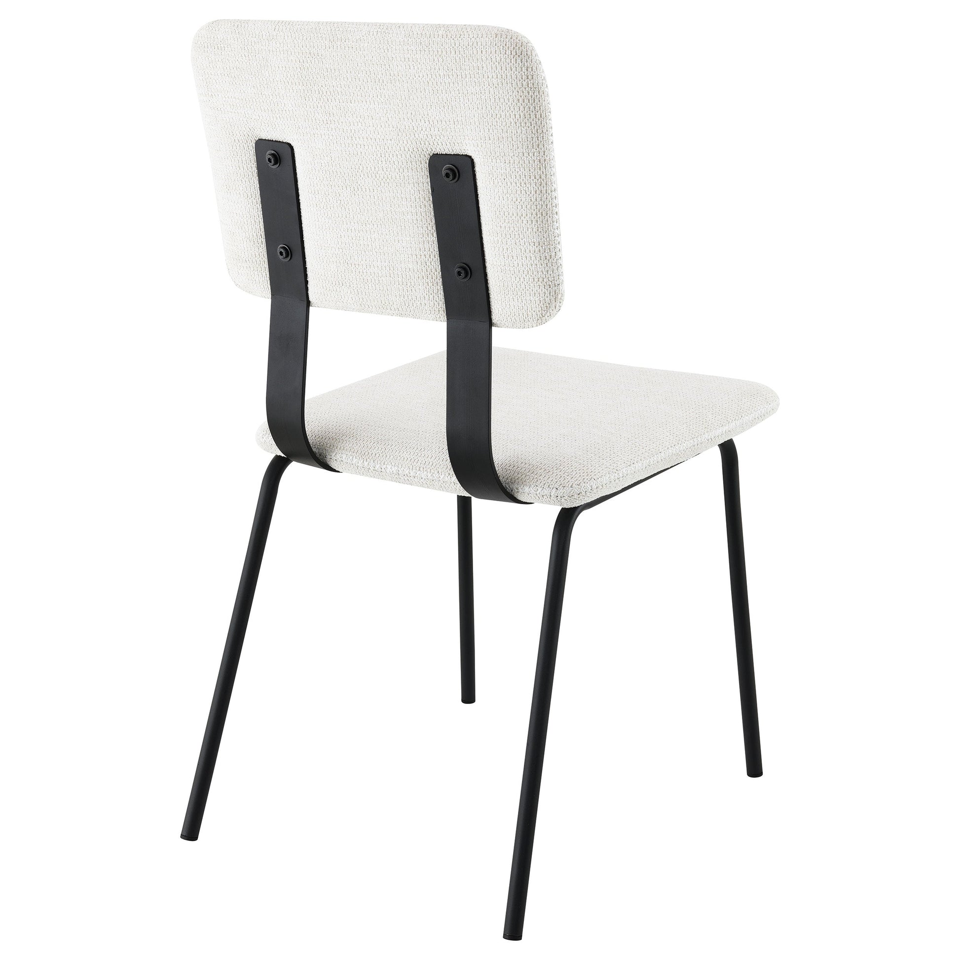 Reimagine your comfortable and inviting dining table with a set of two modern side chairs. Each features an armless profile with clean, slim lines for a versatile design. Sure to complement in a variety of settings, the chairs feature slim cushions with neutral upholstery that offers comfortable seating for friends and family. Each chair features a black finish base, complete with inverted U-shaped legs and thick back supports that add depth and contrast. Choose this set for a modern dining table in your kitchen or dining room.