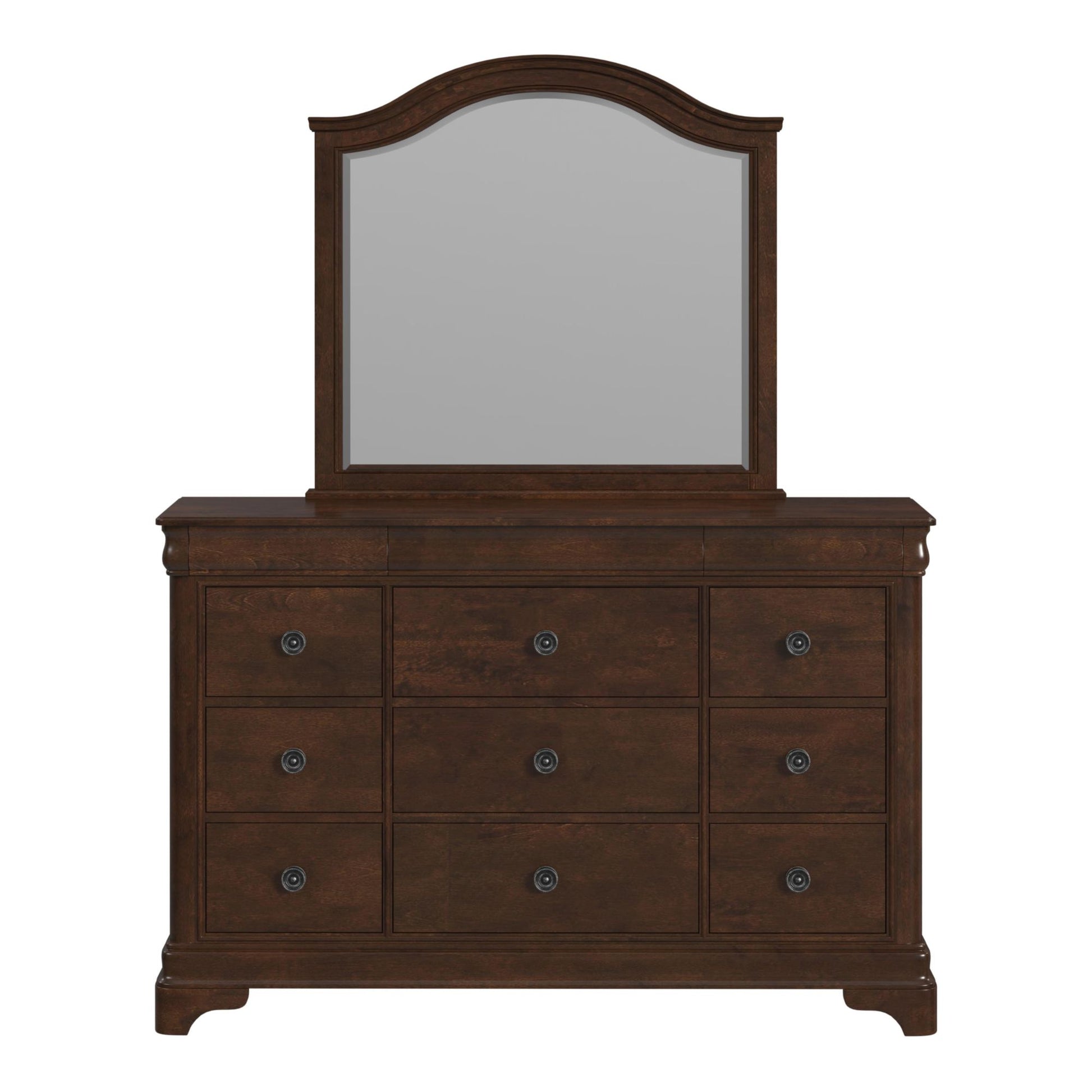 The Cameron Cherry Dresser & Mirror Set combines curves, sleek lines and a warm cherry finish to render classic refinement.Ê The twelve drawer dresser is solidly built with custom select hardwoods and birch veneers. ÊThe three top hidden drawers feature felt-lining which offers a safe place for your treasured items.ÊThe beautify beveled mirror is surrounded with an elegant arched frame.