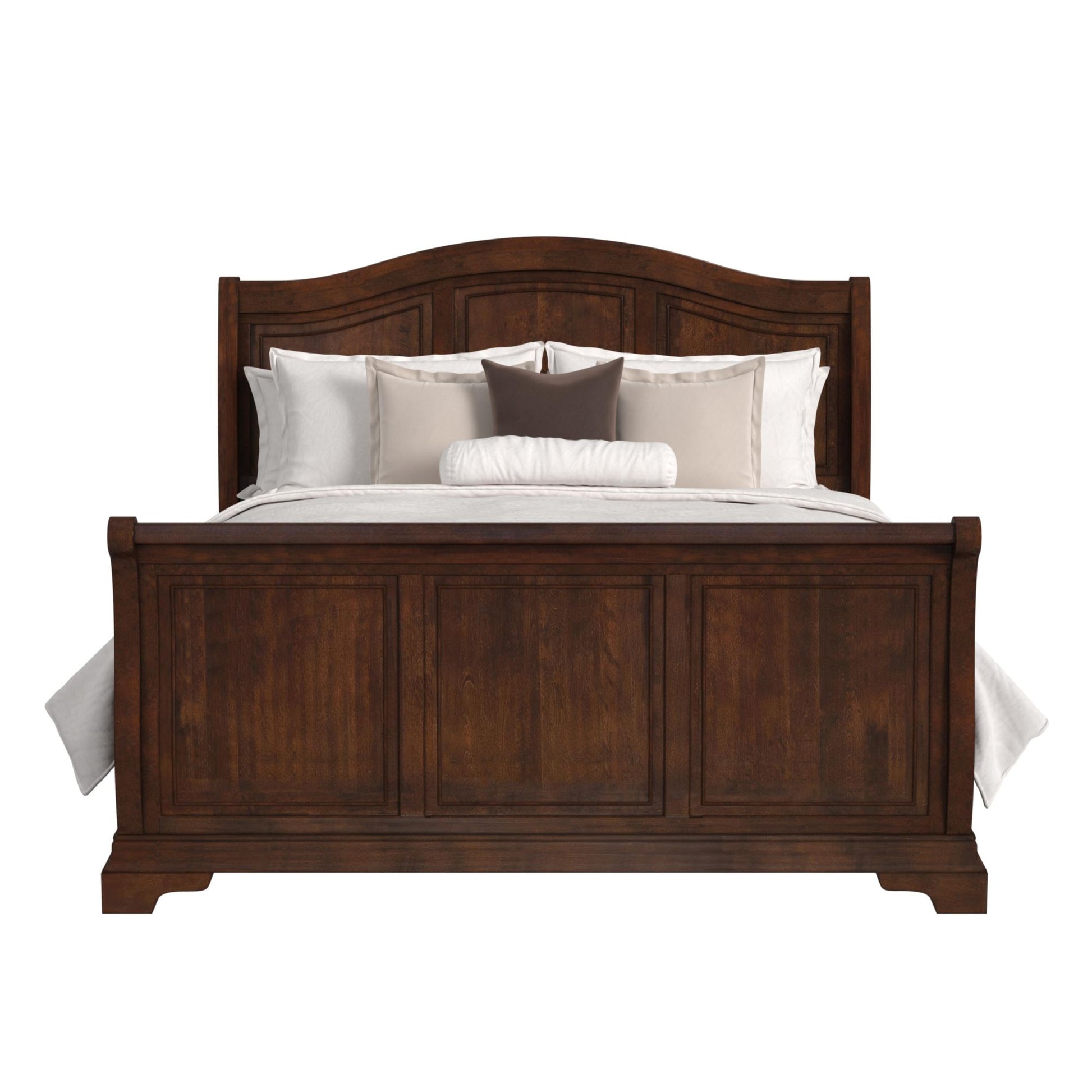 The Cameron Cherry King Sleigh Bed combines curves and sleek lines with a warm cherry finish to render classic refinement. This bed has a gently arching headboard with carved panels and a sleigh style footboard.
