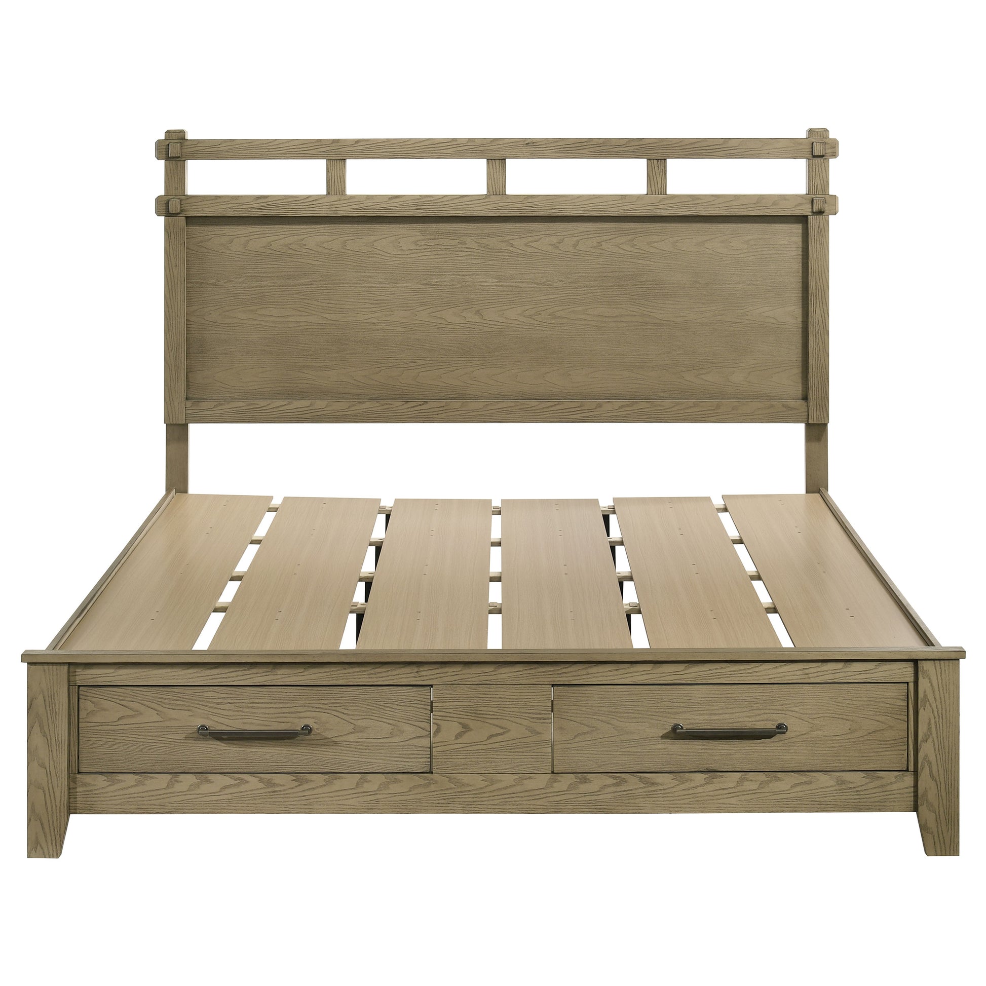 Queen platform storage bed finished in vineyard oak with oak grain embossed veneer