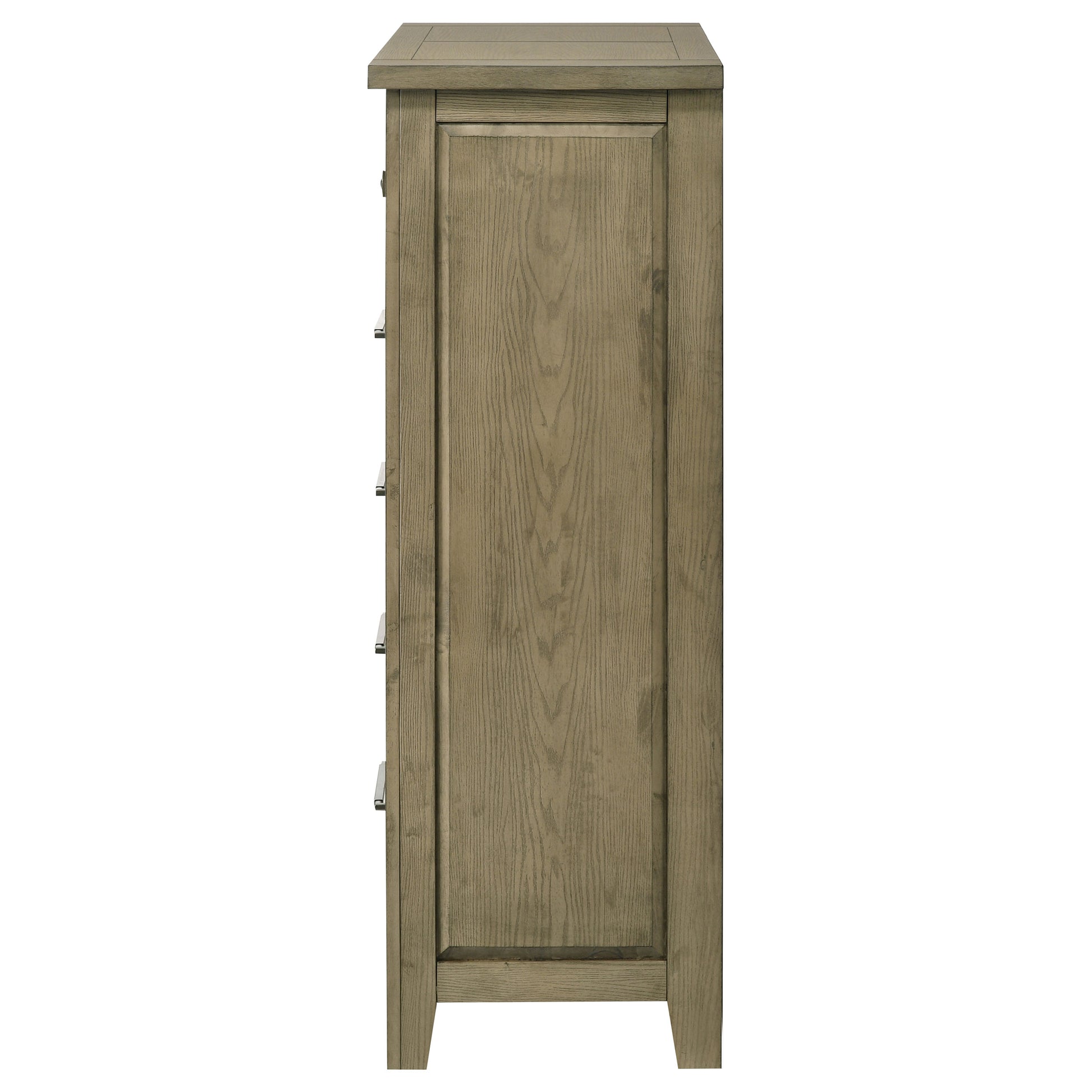 Designed with a relaxed sensibility, this five-drawer chest of drawers blends classic structure with subtle rustic appeal. Its vineyard oak finish highlights the oak grain embossing across solid rubberwood and engineered veneer surfaces. Antique nickel pull handles add a touch of industrial charm, while heavy-duty ball bearing glides ensure smooth, dependable drawer operation. A balanced blend of softness and strength for modern bedroom storage.