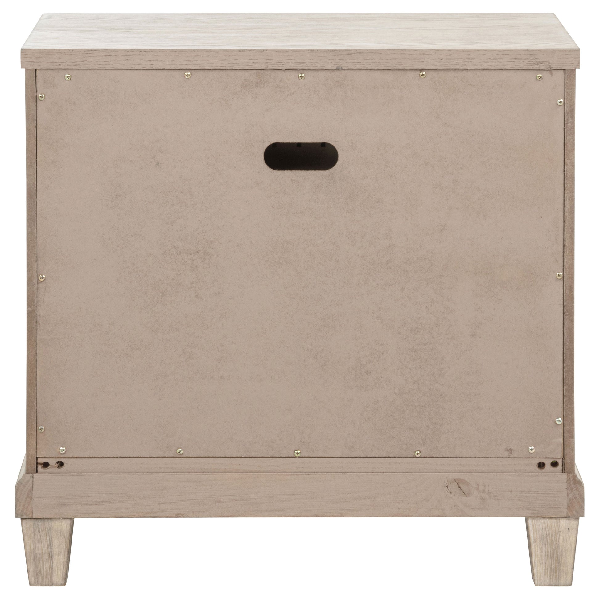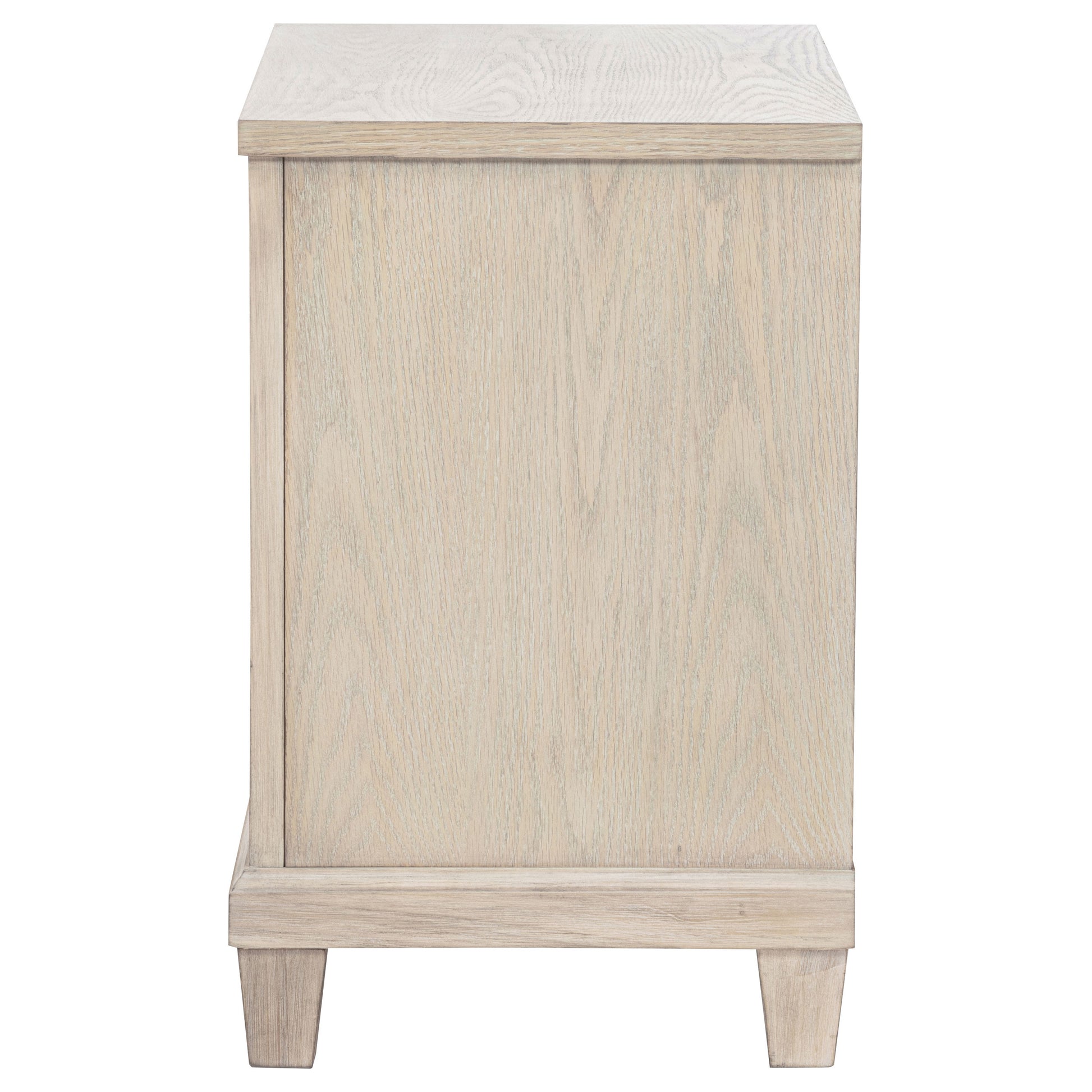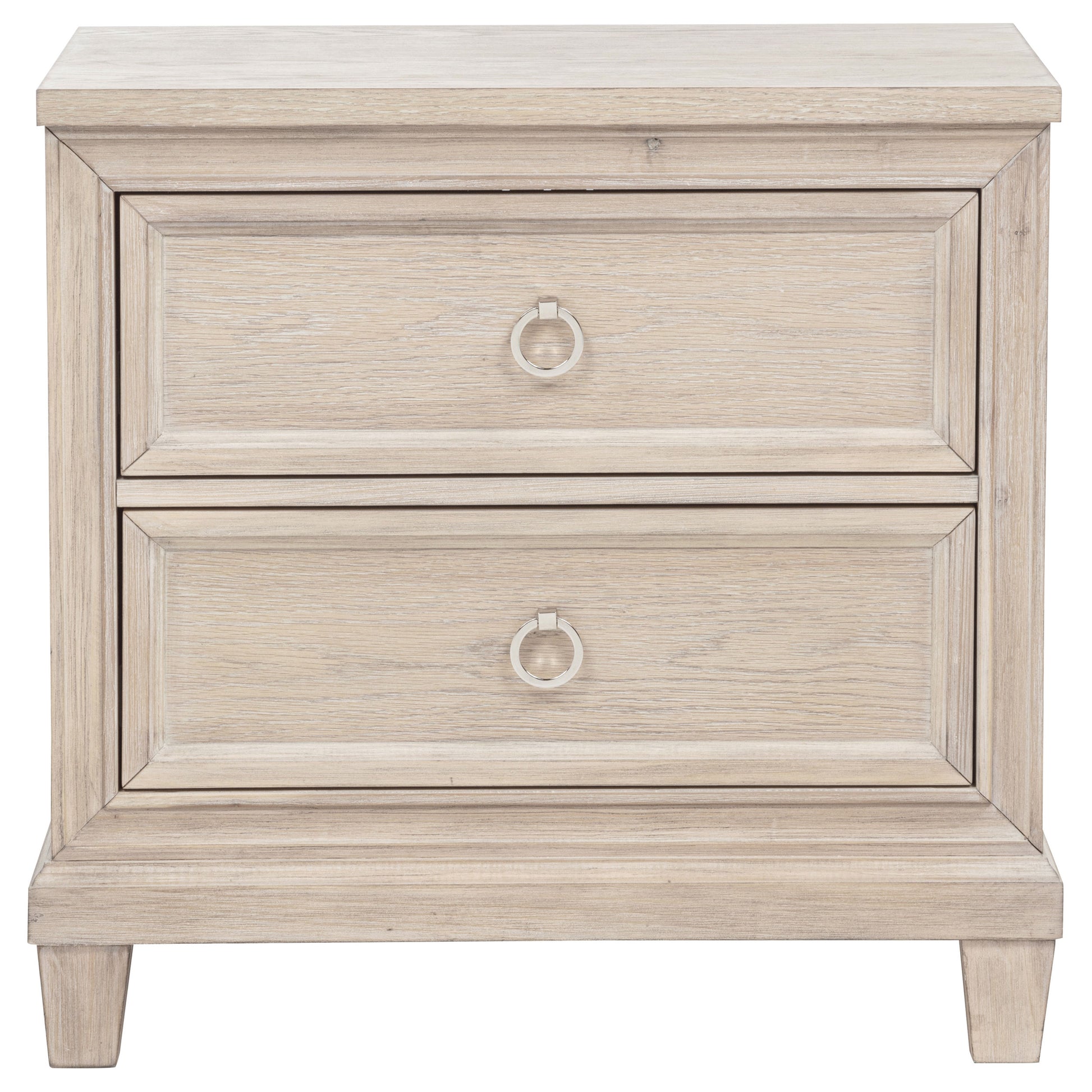 Effortlessly elegant and thoughtfully designed, this two-drawer nightstand brings refined charm to the bedside. Framed with stepped trim and finished in breezy washed oak, it offers a light, coastal-inspired presence. Polished nickel ring pulls add a glint of elegance, while built-in cable access discreetly manages devices tucked inside the upper drawer. Crafted from poplar, oak veneer, and engineered wood, it marries timeless style with everyday convenience.
