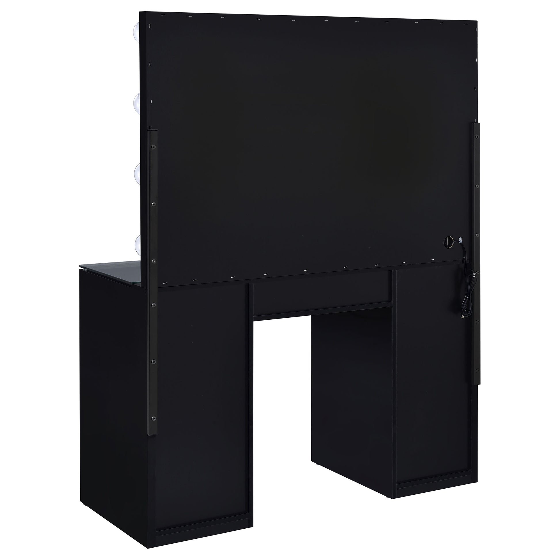 Create space for all your makeup, skincare and hair needs with this contemporary lighted vanity table and mirror. A sleek, fresh look, it boasts a glass top that allows you to see items placed in top drawers. Seven drawers total create easy opportunity for organization of all your products. A cabinet adds adjustable shelving for larger items. The mirror is lighted on three sides, offering multi-directional illumination for even lighting as you apply makeup or fix your hair.