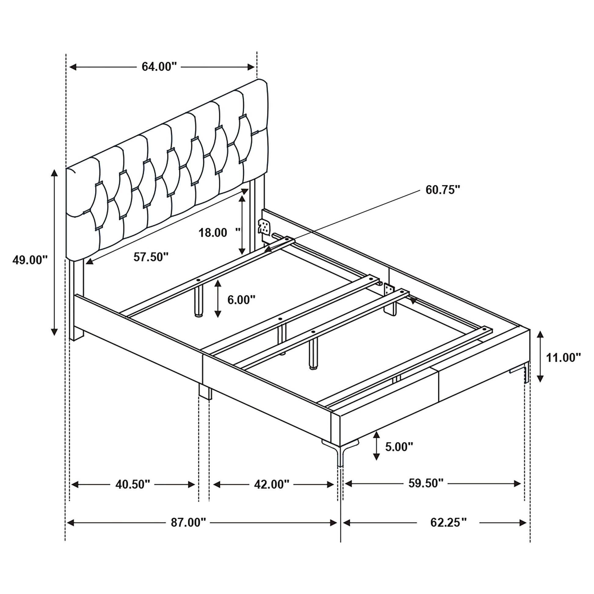 Queen Bed :64.25"w x 87.00"d x 49.25"h
