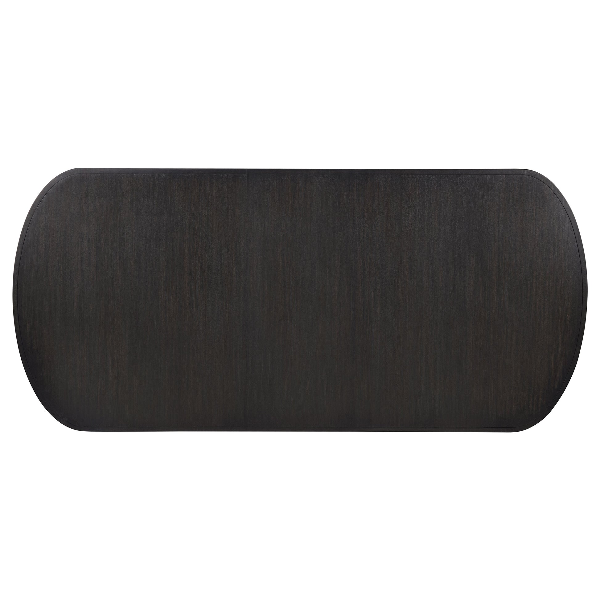 Rooted in quiet strength and sculptural beauty, this extension dining table brings graceful presence to every gathering. Its soft-edged rectangular top rests on a bold pedestal base, finished in burnished black for depth and contrast. When needed, a removable leaf extends the surface with the help of equalizing metal cable glides, allowing for smooth expansion. Whether hosting intimate dinners or festive occasions, this table adapts with effortless elegance.