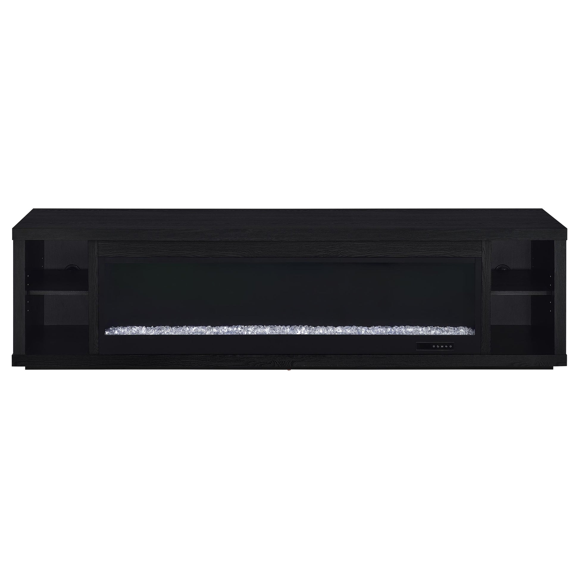 This sleek fireplace media console brings warmth and streamlined storage to contemporary living spaces. A wide electric firebox glows over crushed acrylic crystals, offering fifteen customizable flame colors operated by a wireless remote. Open side compartments with adjustable shelves store devices or dcor, while rear cable management cutouts keep wires out of sight. Finished in classic black and crafted from engineered wood with a laminate veneer, it serves as a refined TV stand or entertainment center. Please note that this console does not include a heat function.