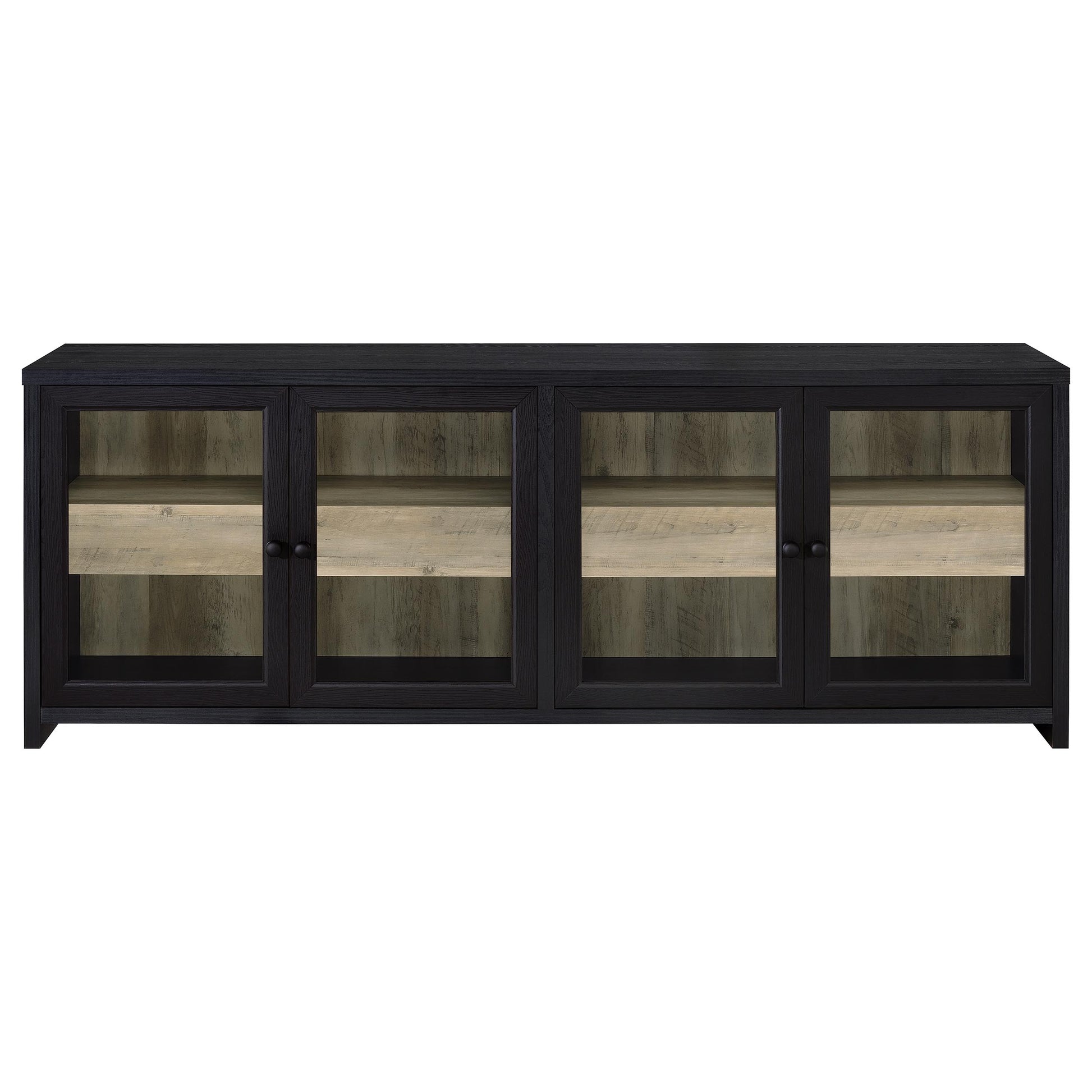 This expansive media console merges bold presence with discreet practicality. Framed in a striking black finish, four glass doors reveal warm wood-look interiors with hidden drawers behind each panelÑperfect for tucking away remotes, devices, and essentials. The broad surface accommodates TVs up to 85 inches, while fixed shelving enhances display or storage flexibility. Crafted from engineered wood and clear glass with gunmetal hardware, it delivers a grounded, modern-rustic statement for any living room.