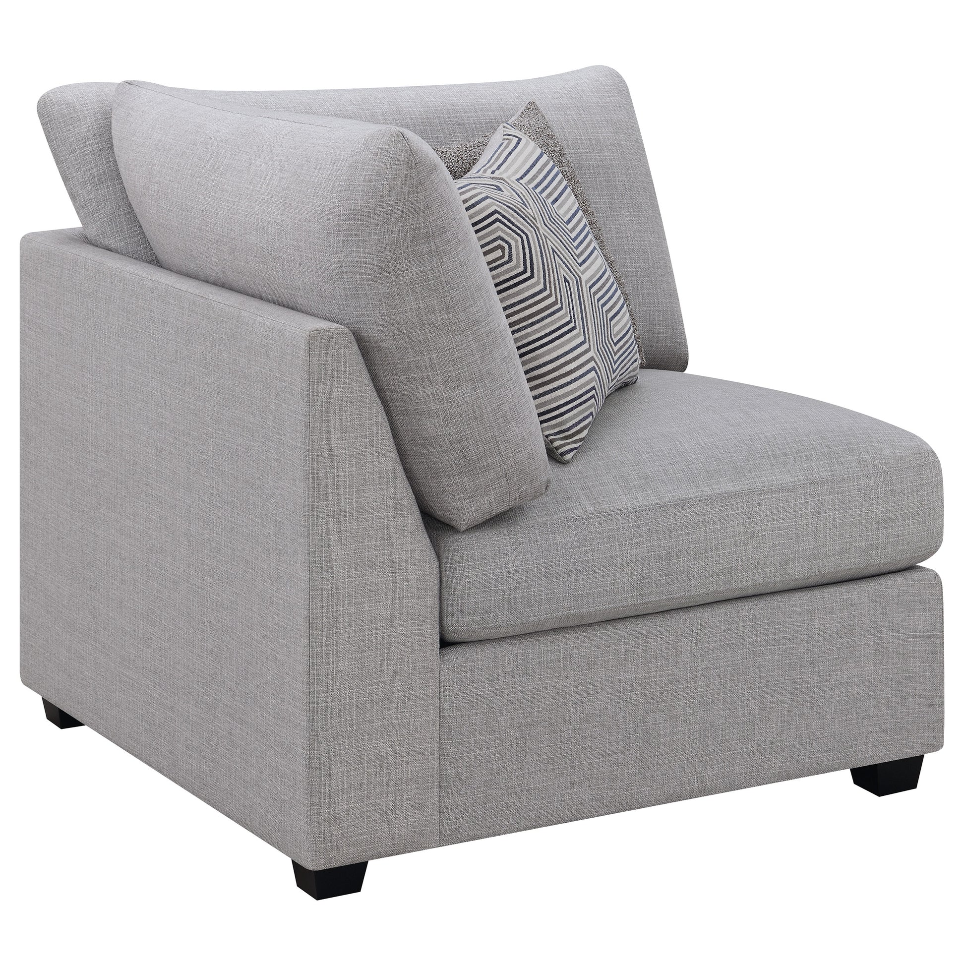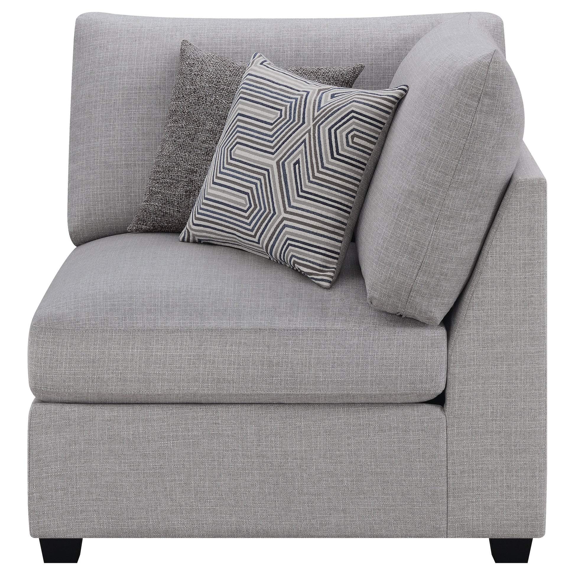 Complete a contemporary motif with the simple silhouette from this modern corner chair. Upholstered in light grey, the fabric complements a variety of neutral and colorful spaces. Ideal for hosts and families, the clean modular design allows for a fully customizable sofa or sectional. Update your seating with the clean and elongated lines on the seat and back cushions. Plush cushions and refined edges add an elegant feel that is full of comfort.