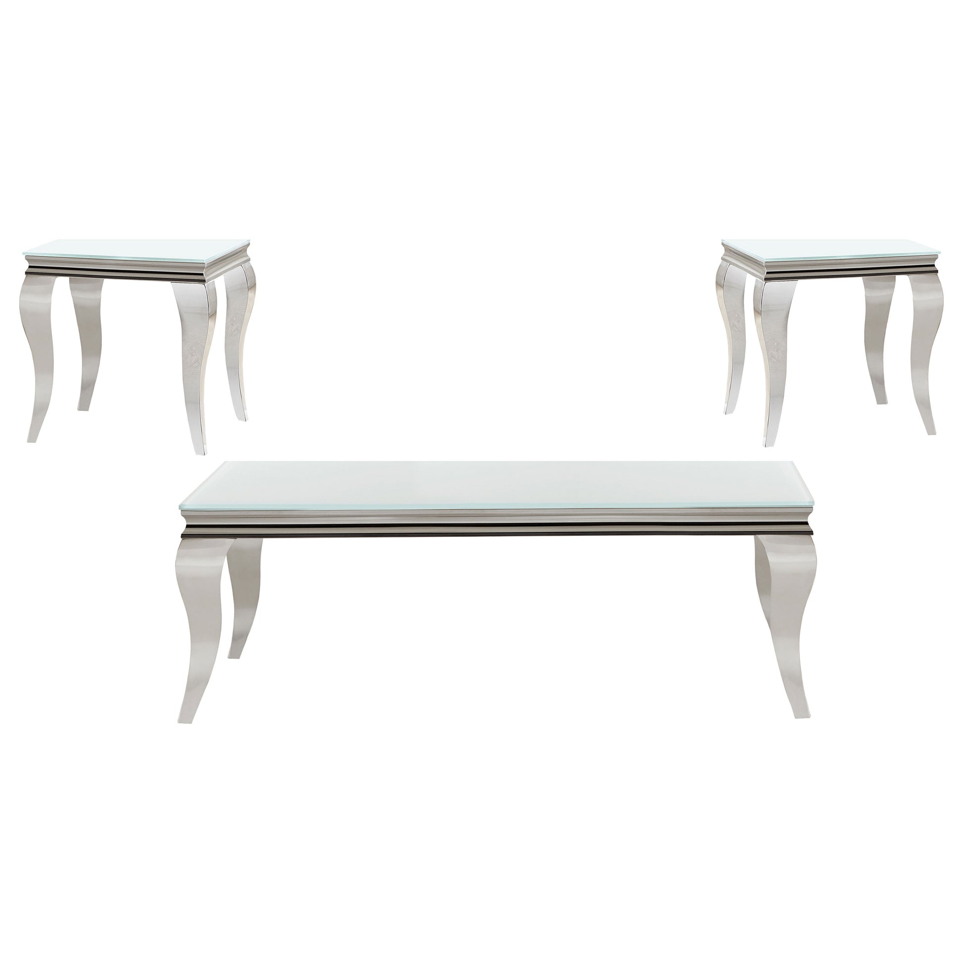 This coffee table set brings modern glam to your living space with tempered beveled glass tops and polished stainless steel cabriole legs. The reflective finish and gracefully curved Queen Anne style legs create a harmonious blend of timeless elegance and a majestic ambiance. Ideal for refined interiors, this set combines an ultra-modern aesthetic with durable practicality. Smooth, easy-to-maintain surfaces ensure it remains a stylish and functional centerpiece for any sophisticated space.