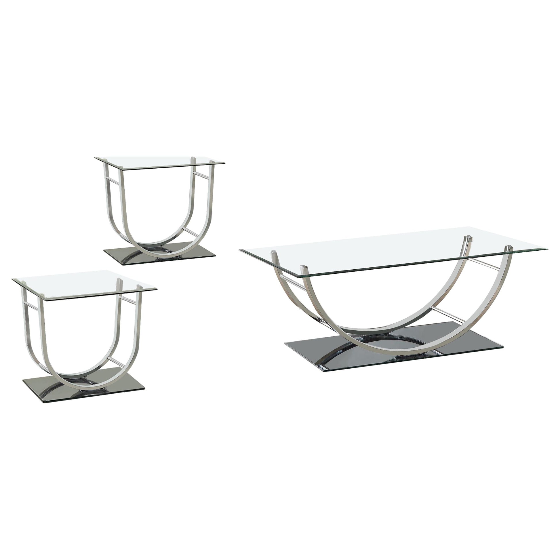 This modern coffee table set features a clear tempered glass top complemented by sleek mirrored bases, delivering a bold and sophisticated look. The curved frames are crafted from electroplated heavy gauge metal with a polished chrome finish, adding a touch of elegance and durability. Designed for contemporary living rooms, this set provides both visual appeal and functionality, making it a perfect centerpiece while ensuring long-lasting quality and reliable performance.