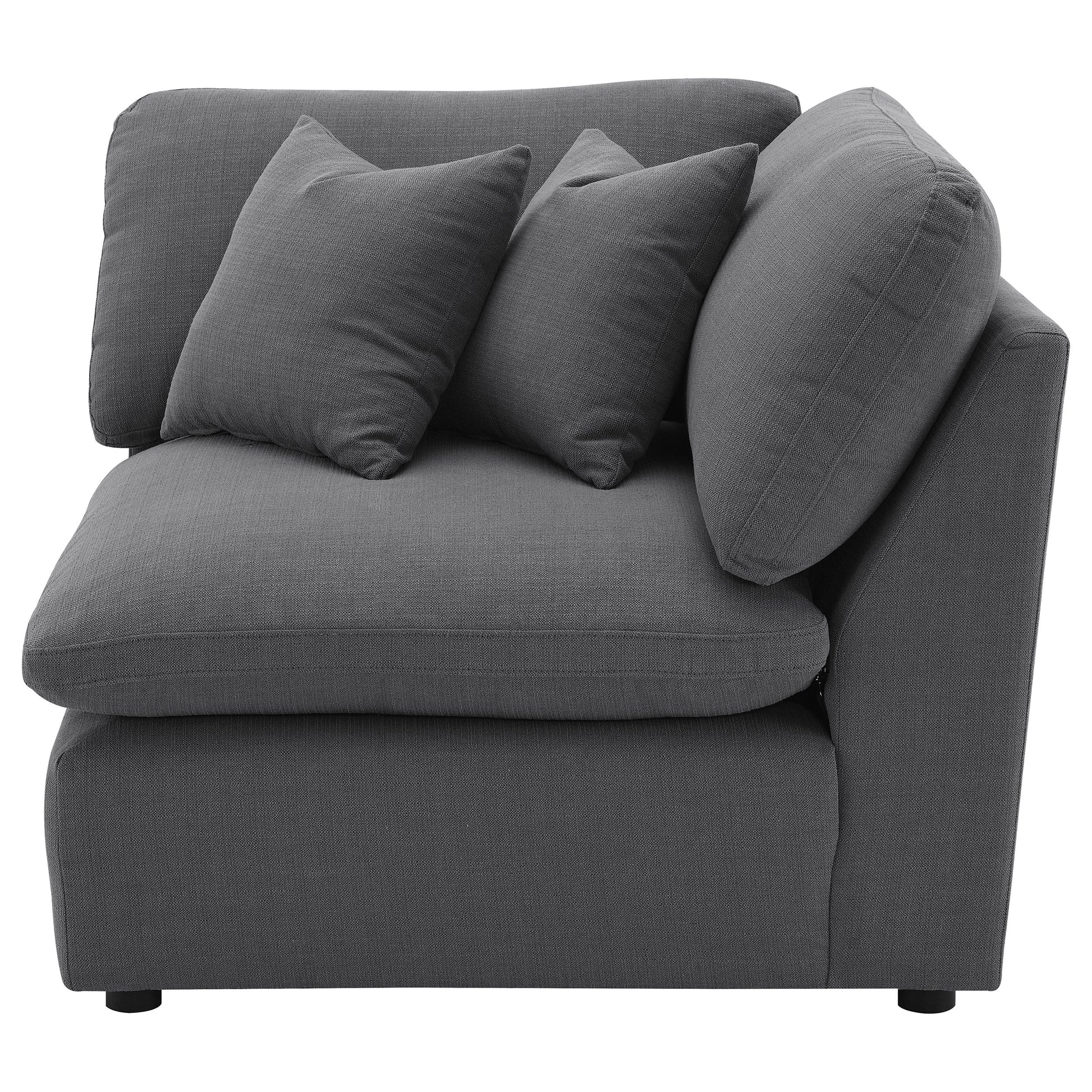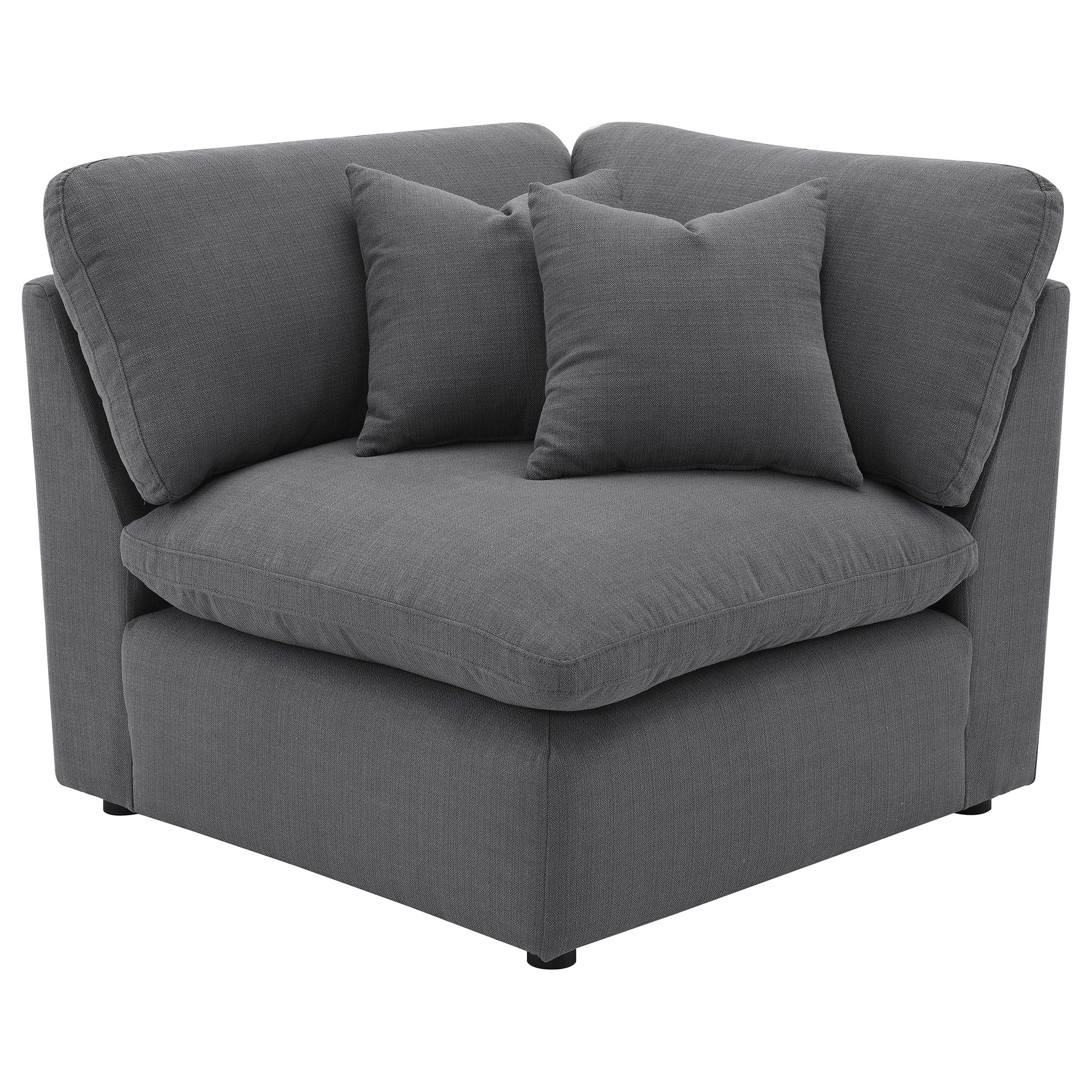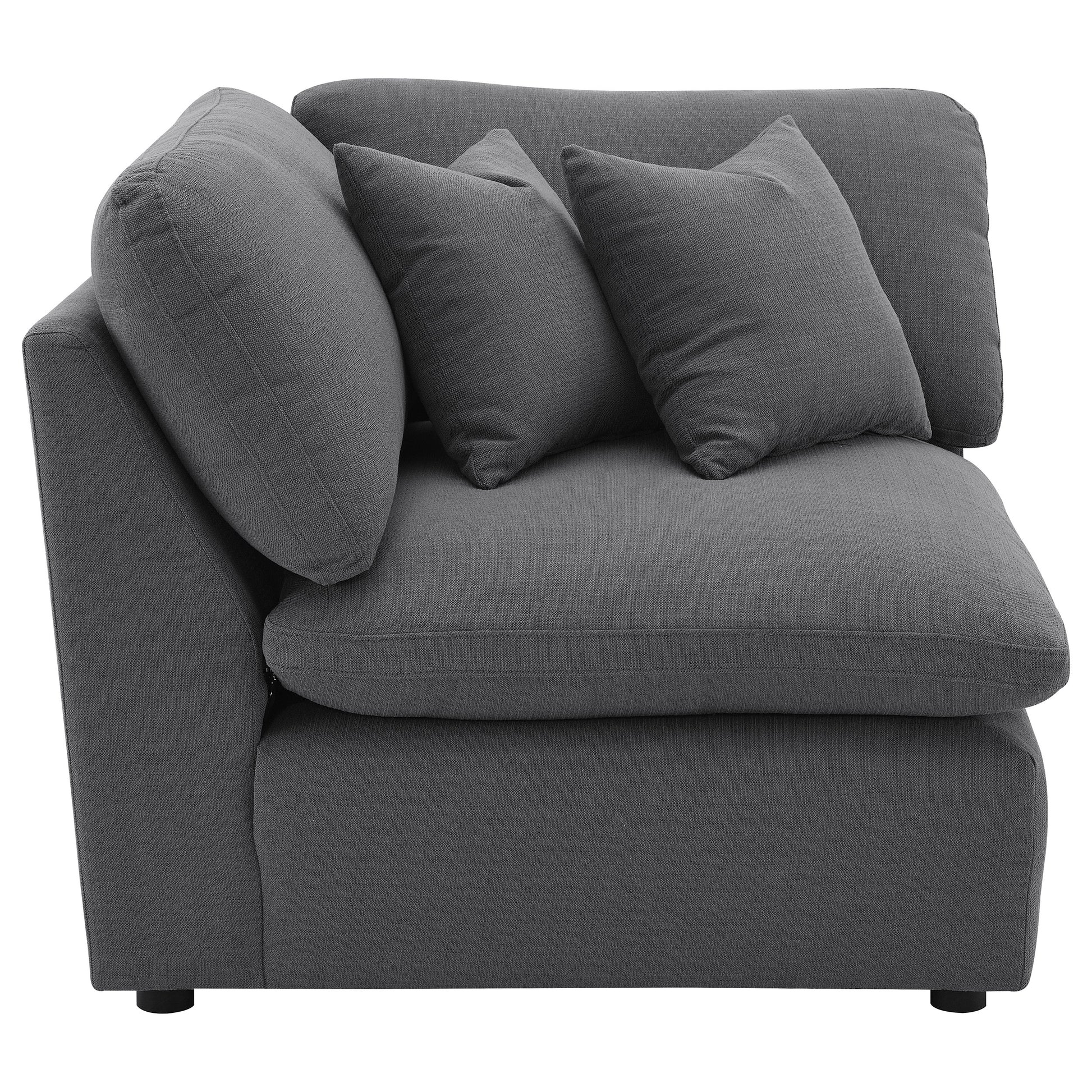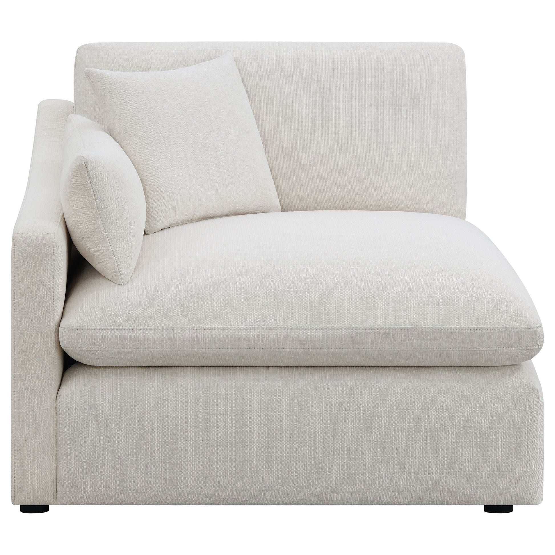 Complete your spacious modern living room with this beautifully designed modular sectional, featuring soft, textural fabric. Feather blend-wrapped box cushion seating with reversible cushions and topstitched details, paired with a thin track arm design, create a sleek, modern aesthetic to elevate your family room and beyond. Matching accent pillows and plush back cushions add extra comfort, nestled against the sloped track armrests. This sectional is perfect for complementing your existing decor, welcoming neutral tones, or providing a sophisticated backdrop to vibrant colors.