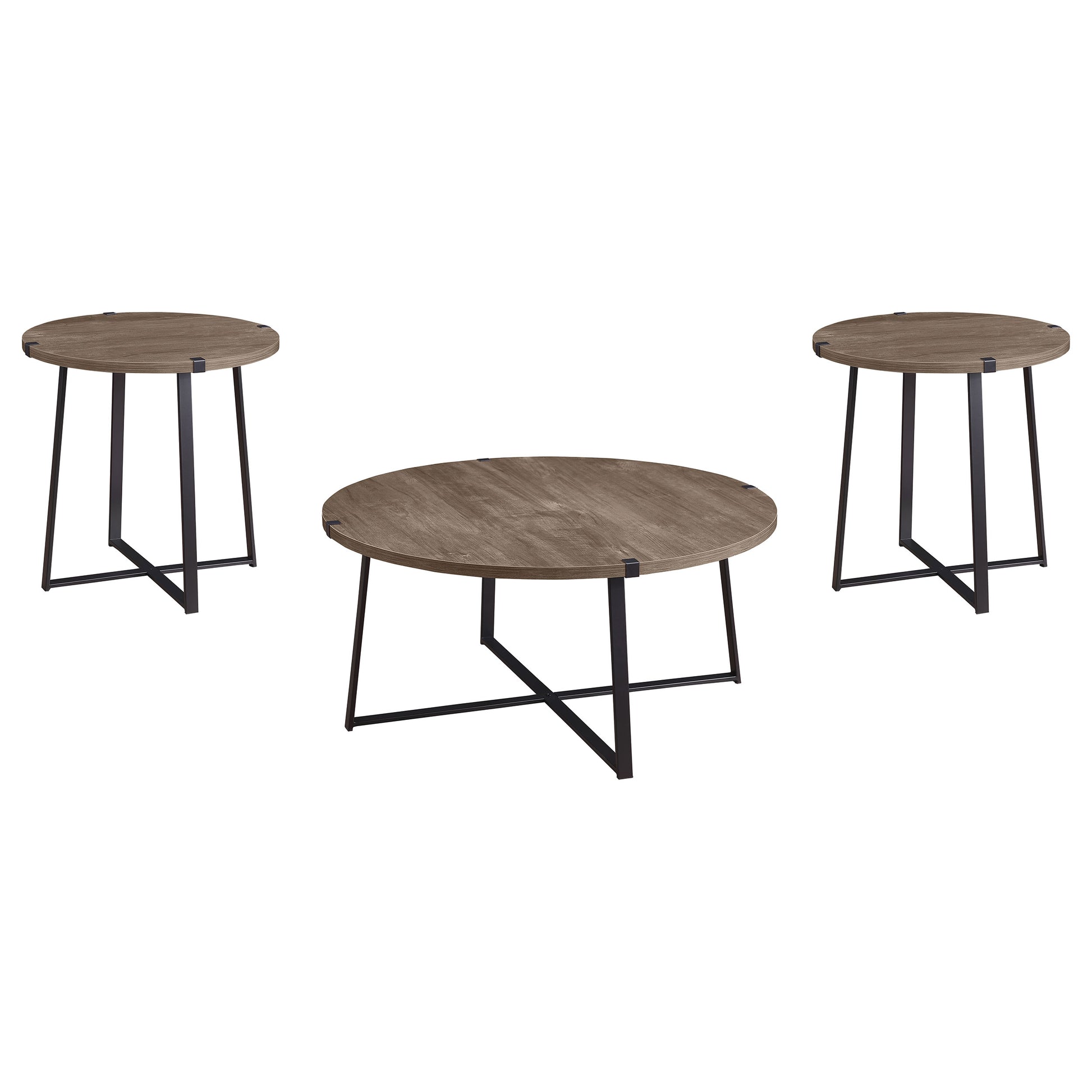 Create a cohesive and stylish living space with this modern coffee table set, designed for both form and function. Featuring engineered wood tops in a warm light brown finish, the set highlights natural wood grain textures for an inviting aesthetic. Each piece rests on a sturdy black powder-coated metal base with intersecting supports for stability. Bracket accents at the edges lend a touch of industrial character. The scratch-resistant laminate veneer ensures durability, making this set perfect for busy living areas.