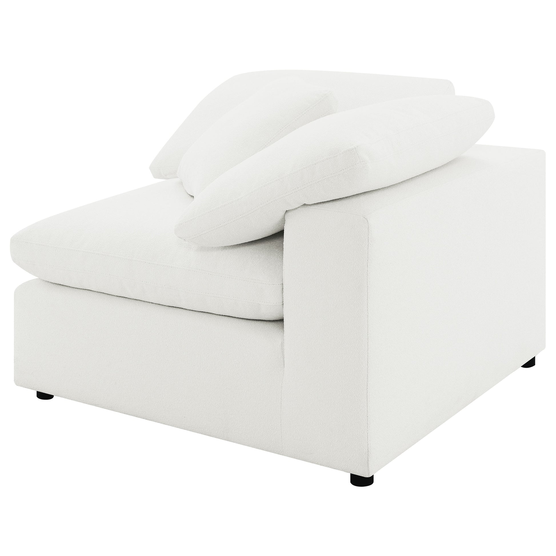 Design a custom configuration for your modular sectional with a modern corner chair. This foundational piece features neutral water-resistant boucle upholstery for an on-trend look and feel that works in a variety of homes and living spaces. The corner chair connects with armless chairs, creating an L-shaped bend or ending a straight section, creating a custom sectional setup in your living room. Foam cushions pair with feather blend for exceptional comfort and a plush feel you'll love when lounging. A loose pillow back with two full-sized pillows and an accent pillow completes the look.