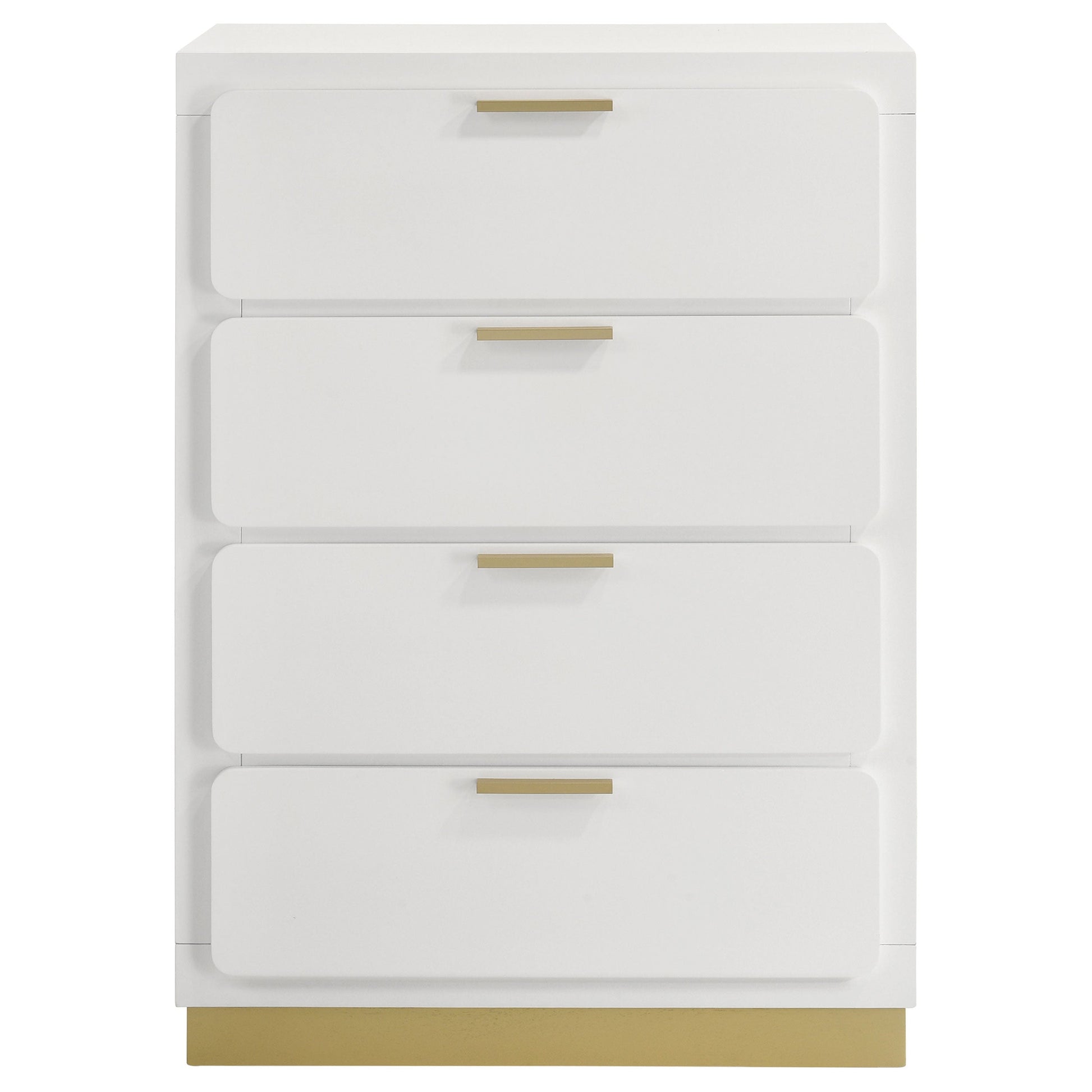 Modern luxury with a minimalist look offers a perfect fit for updated bedrooms as the four-drawer chest enhances a sleek master suite or guest bedroom. Wood and wood products construct a dresser with clean lines and a stylish Mid-Century Modern vibe. This chest offers simplicity with sleek elegance, as accents include straight drawer handles and a matching base. Spacious drawers operate smoothly on center drawer glides. Choose this chest for its versatility and convenience, accompanying either matching or coordinating pieces to pull a statement-making look together.