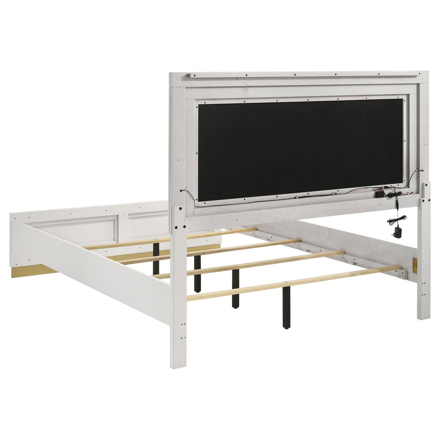 Build a modern bedroom oasis with the chic style and impressive simplicity of a contemporary bedroom set. The set offers abundant storage in various drawers, with a chic two-tone finish complete with bar drawer pulls and metallic kickplates that add dimension. The centerpiece of the set is a streamlined bed design complete with an upholstered headboard. Light gray fabric is lightly padded, offering impressive comfort for lounging. Built-in LED strip lighting surrounds the upholstered panel and is operated with a touch switch for easy, inviting ambiance and a low-profile footboard completes the look with, airy, modern appeal.