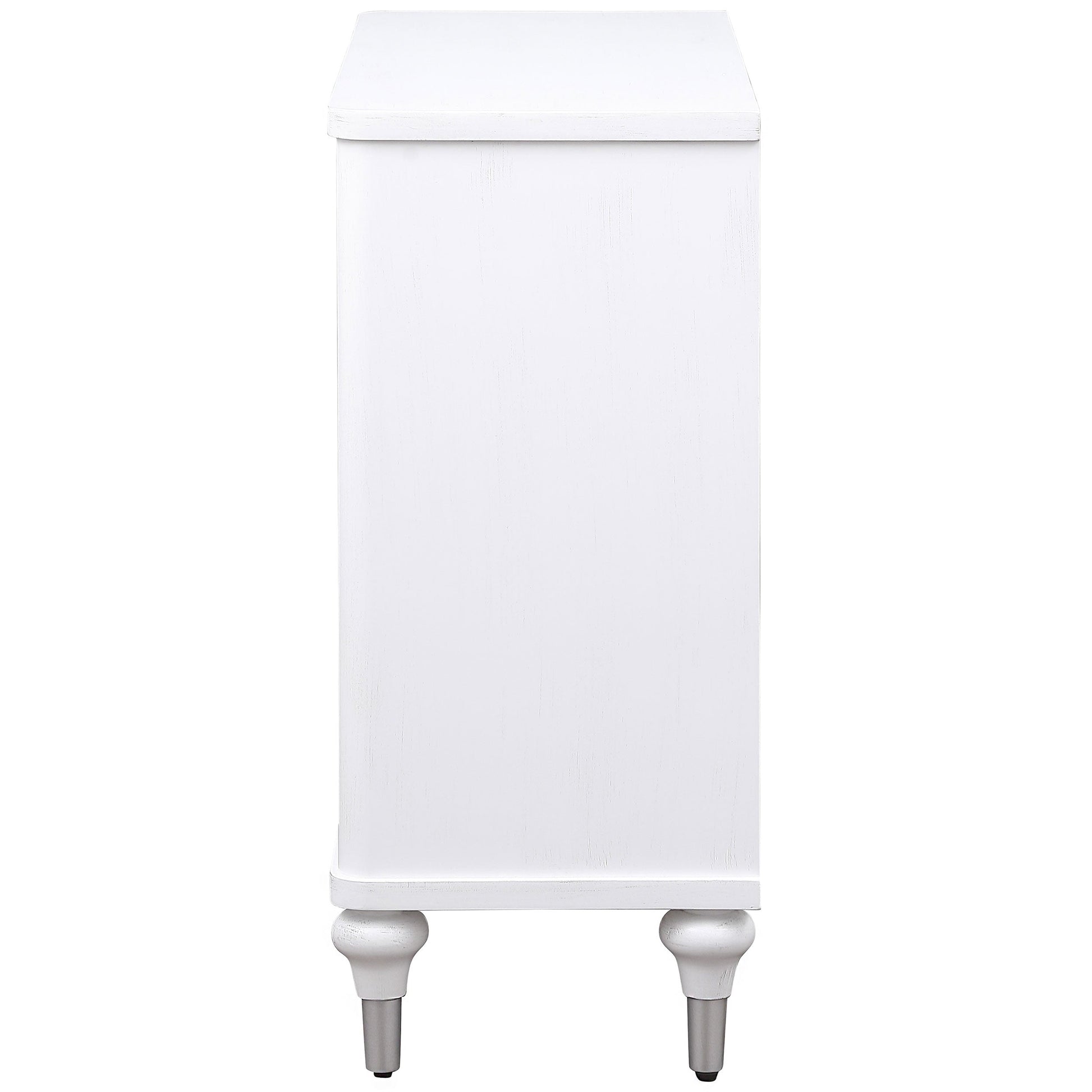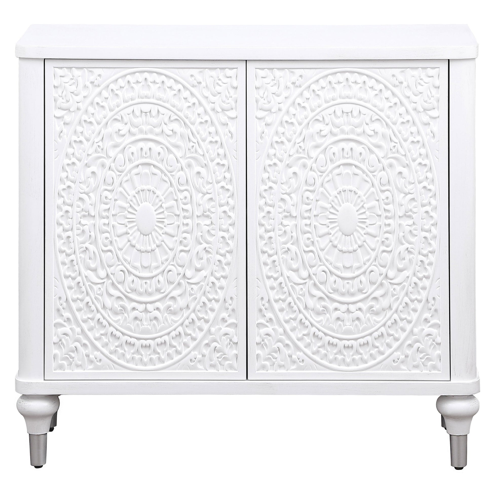 Put the last touches on a stylish space with the added storage and impeccable style of a modern accent cabinet. Featuring two decorative magnetic push-to-open doors, it's the perfect addition in any space, offering ample interior space with an adjustable shelf. The top creates space for decor or to highlight beautiful artwork hung above. The cabinet boasts a crisp white finish, bringing light, refined character to a pair of floral medallion doors. Curvy legs feature silver-toned caps, adding a hint of contrast and dimensionality in any room.