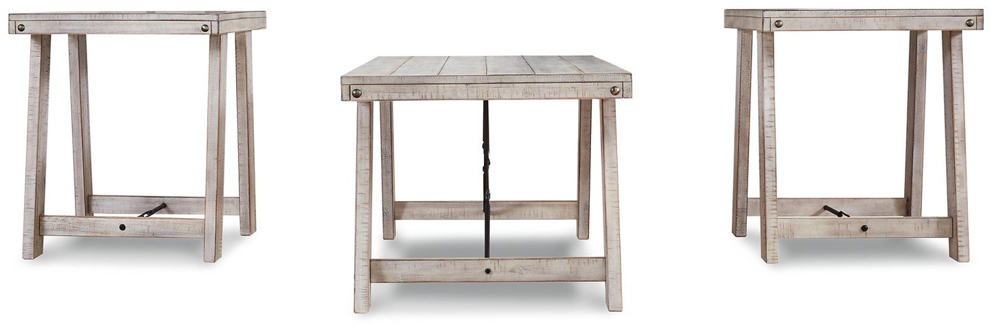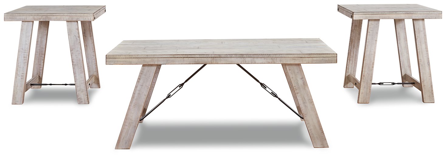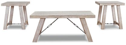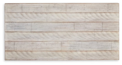 A rustic rendition of modern farmhouse style, this coffee table set is right in tune with your richly relaxed sense of style. The clean yet hearty profile is enhanced with a distressed whitewash finish and offset plank-effect tabletop. Decorative tension bar and nailhead accents add an industrial twist.| Full Dimension | 48W x 24D x 20H |