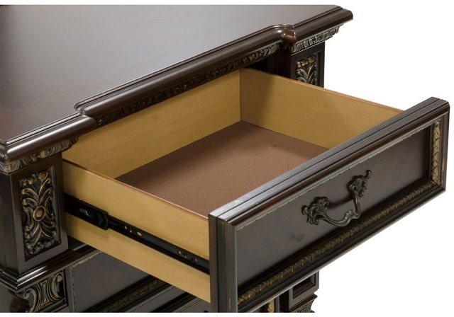 The Catalonia Nightstand showcases Old-World European elegance with its intricate traditional design elements. Crafted with dramatic detailing such as egg and dart molding, acanthus leaf carvings, bead molding, and gold tipping, this nightstand adds a sophisticated touch to your bedroom. The dark bronze fixed-drop hardware with decorative flourish further enhances its regal charm. The cherry veneer and decorative inlay patterns on the top are highlighted by a rich traditional cherry finish, making it both a functional and stunning addition to your bedroom decor.