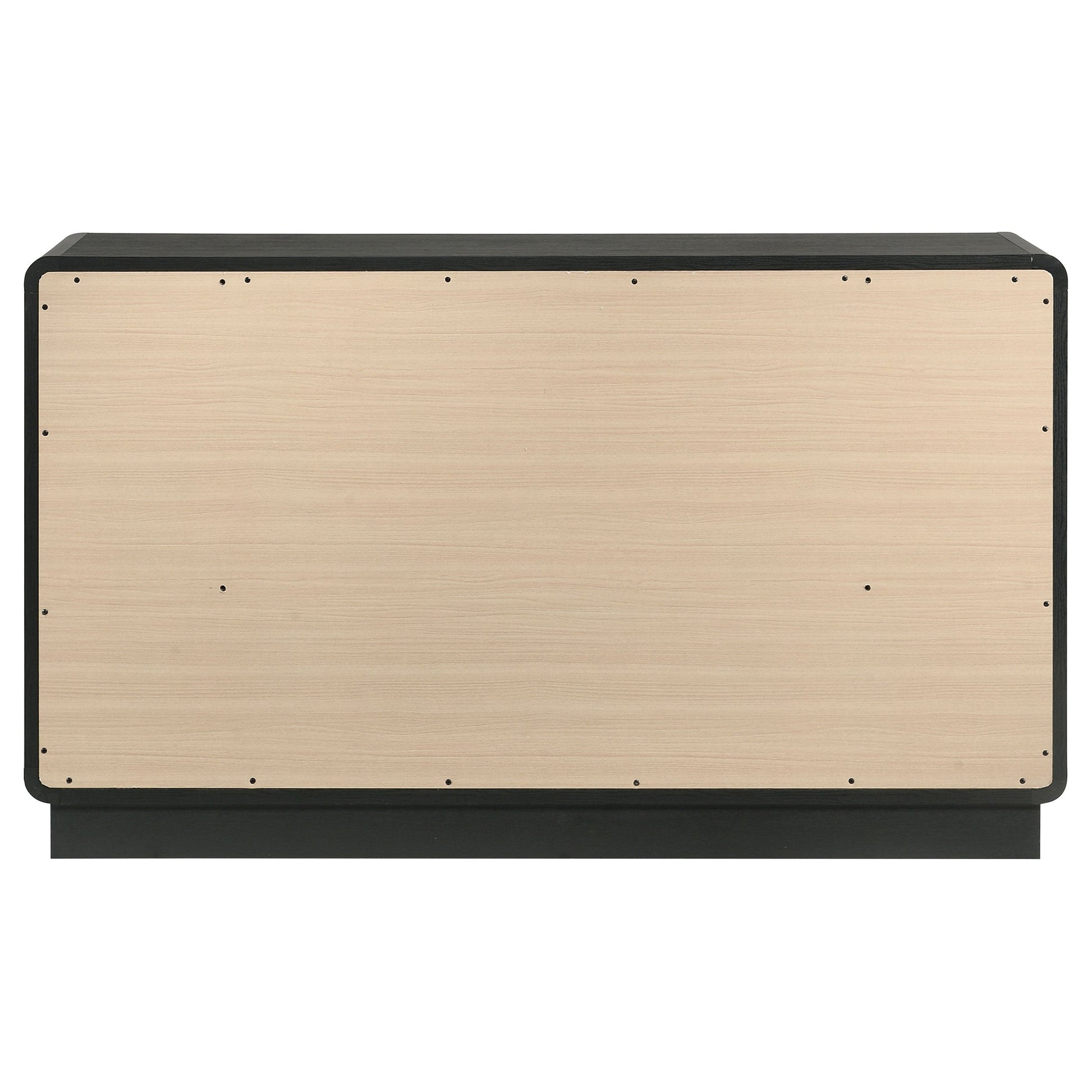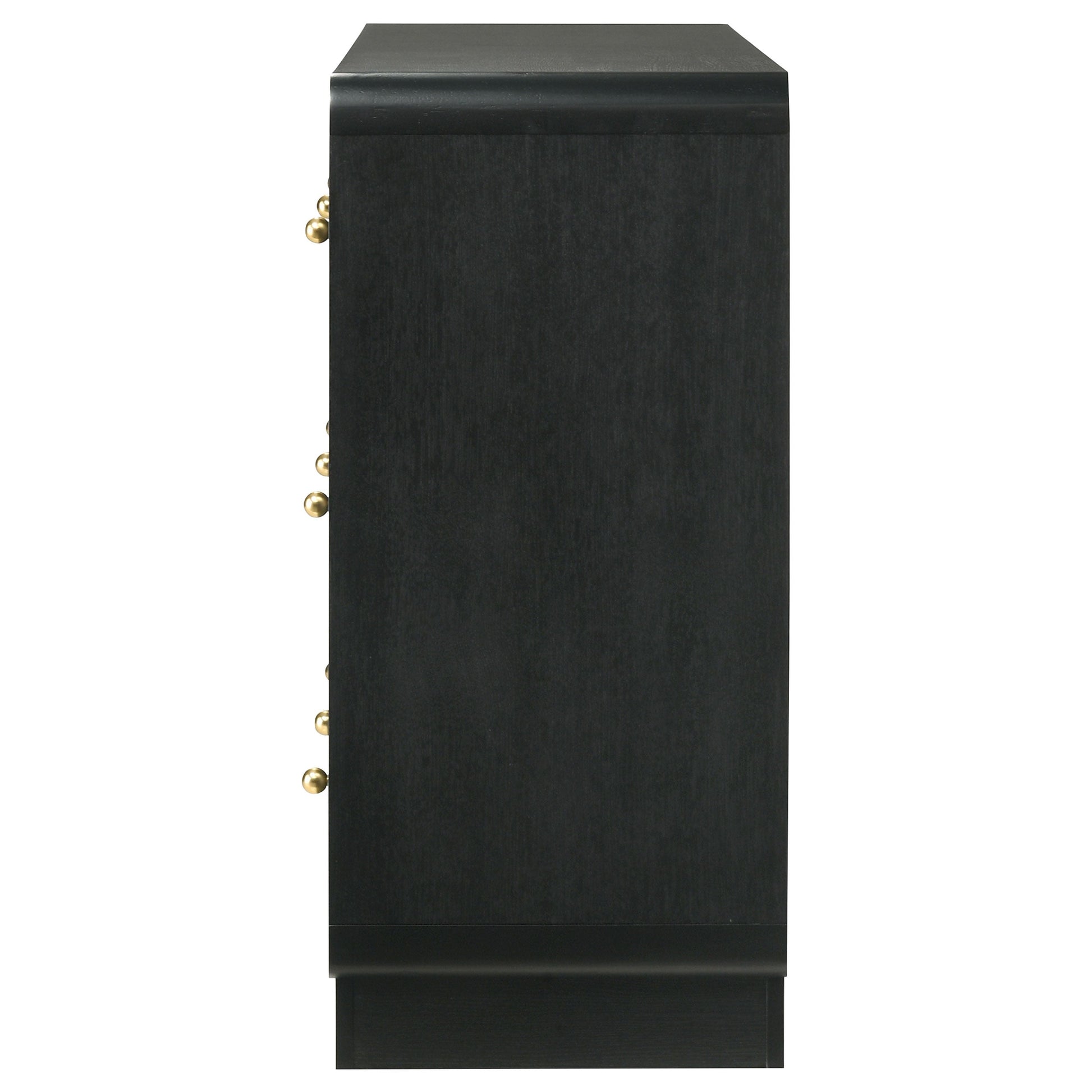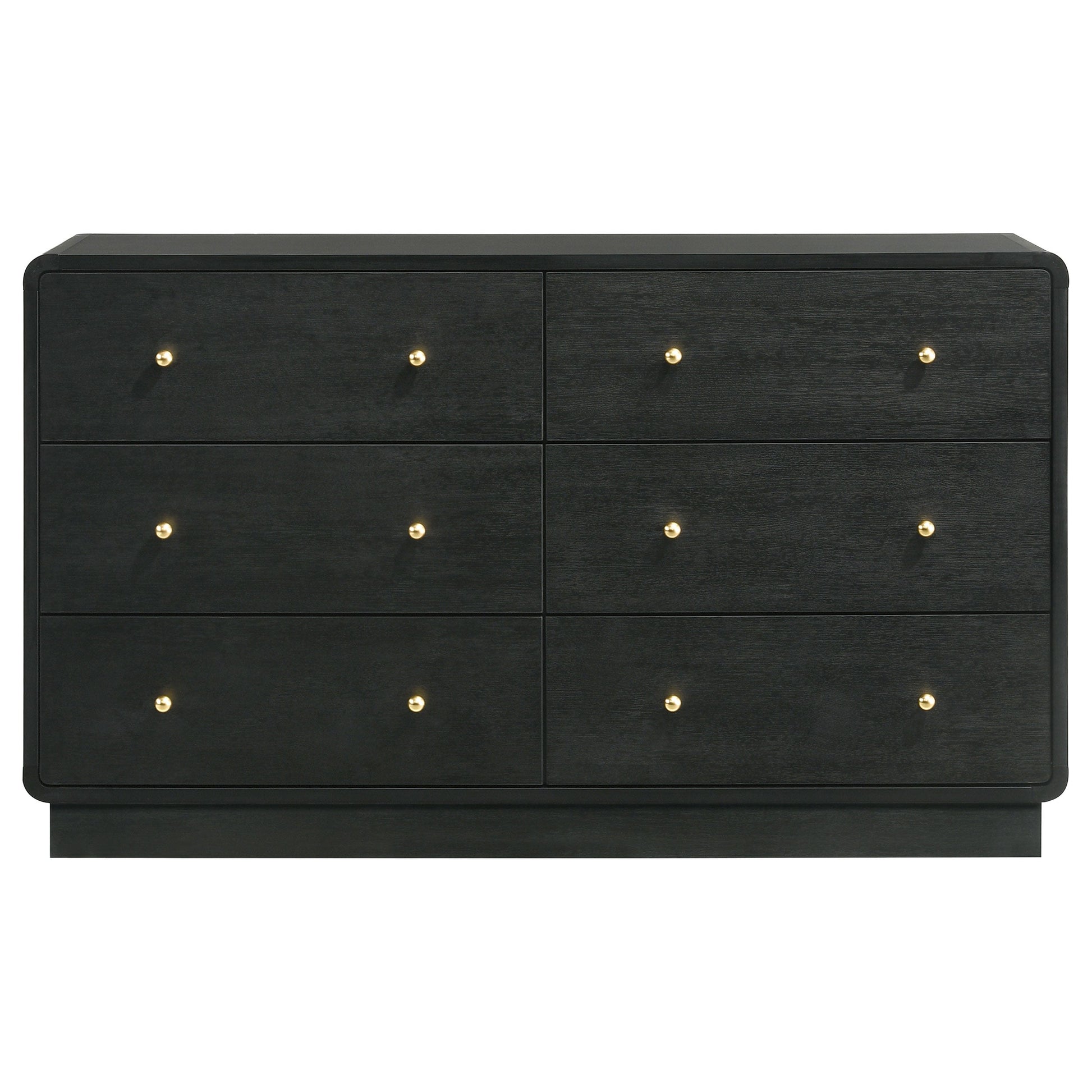 Augment bedroom storage with the plentiful drawer space and stylish presentation of this modern dresser and mirror combination. Its six large drawers facilitate easy organization of clothing and accessories. Each drawer is accentuated with ball knobs in a brass finish, offering warmth and contrast. The dresser and mirror each feature a black finish with rounded corners that soften the bold look and feel. The mirror pairs with a recessed base, each serving to lighten the overall look of this striking dresser.