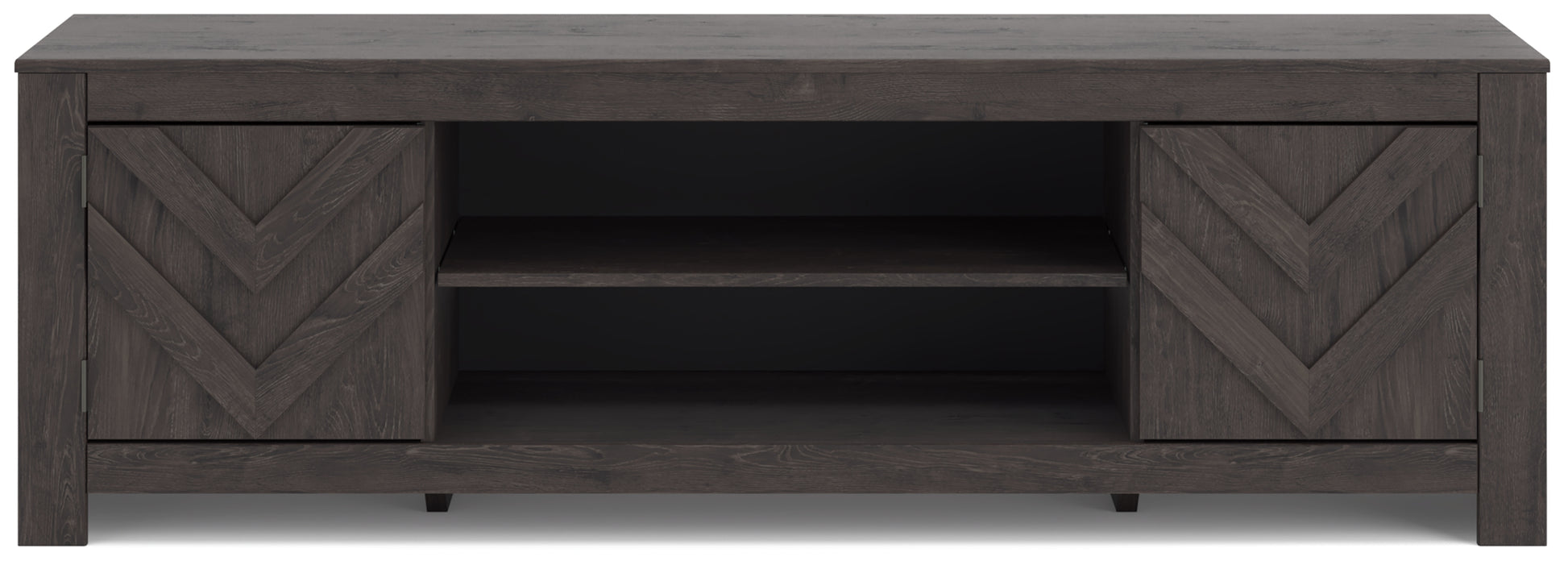 This TV stand embraces a classically charming aesthetic and repurposes it for modern living. Its dark charcoal finish to your love of vintage character, while the chic chevron pattern is effortlessly on trend. And with hidden storage behind the doors, your media accessories stay tucked away in style.