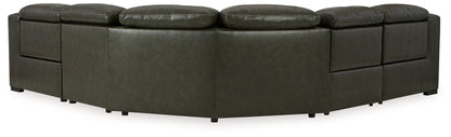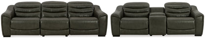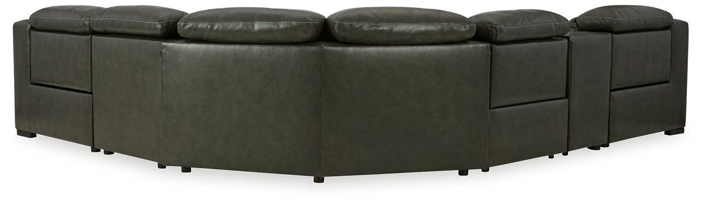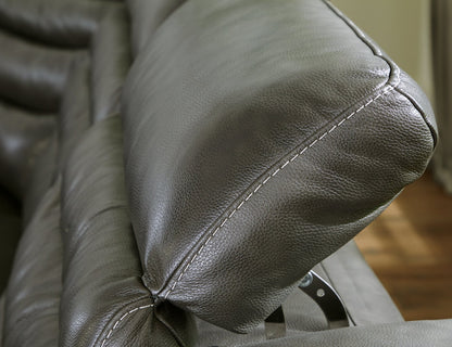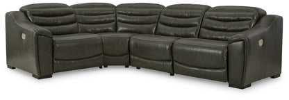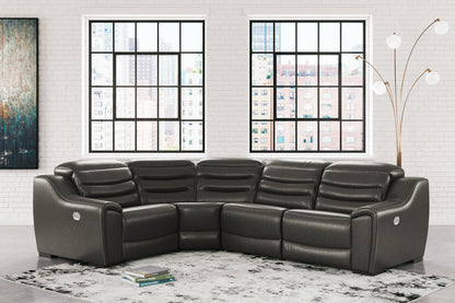 For those seeking to curate a living room retreat that offers superior comfort and a contemporary aesthetic, this sleekly designed power reclining sectional will become your favorite source of at-home serenity. Rest on leather match upholstery, and use the one-touch power control to recline and adjust the headrests with ease. As you recharge after a long day, your devices can too with USB charging. This sectional is visually enticing in a luxe dark gray, with slope track arms and stitched detailing on the back to enhance its modern appeal.