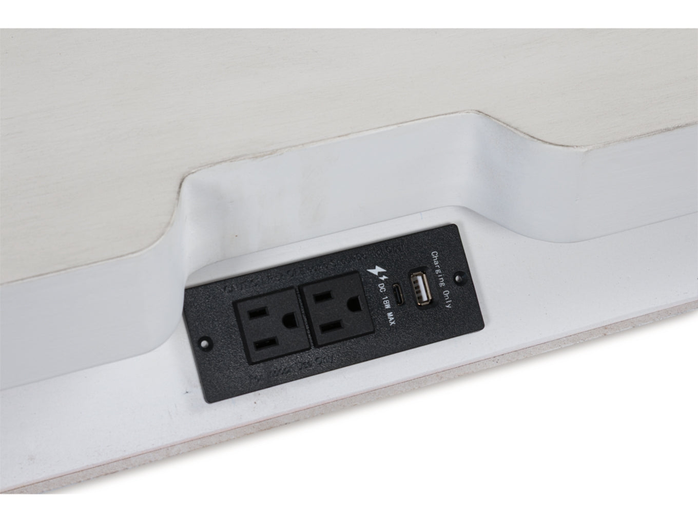 Taking a laid-back approach to casual traditional design, this artfully crafted nightstand combines classic elements with a clean modern approach. Its rubbed antiqued white finish exudes a comfy, timeless appeal that's sure to carry you away to a dreamy time and place. The simple round metal knob and ring pulls on the nightstand's spacious drawers make just the right statement, while an integrated power outlet and USB charging keep your devices powered up overnight.