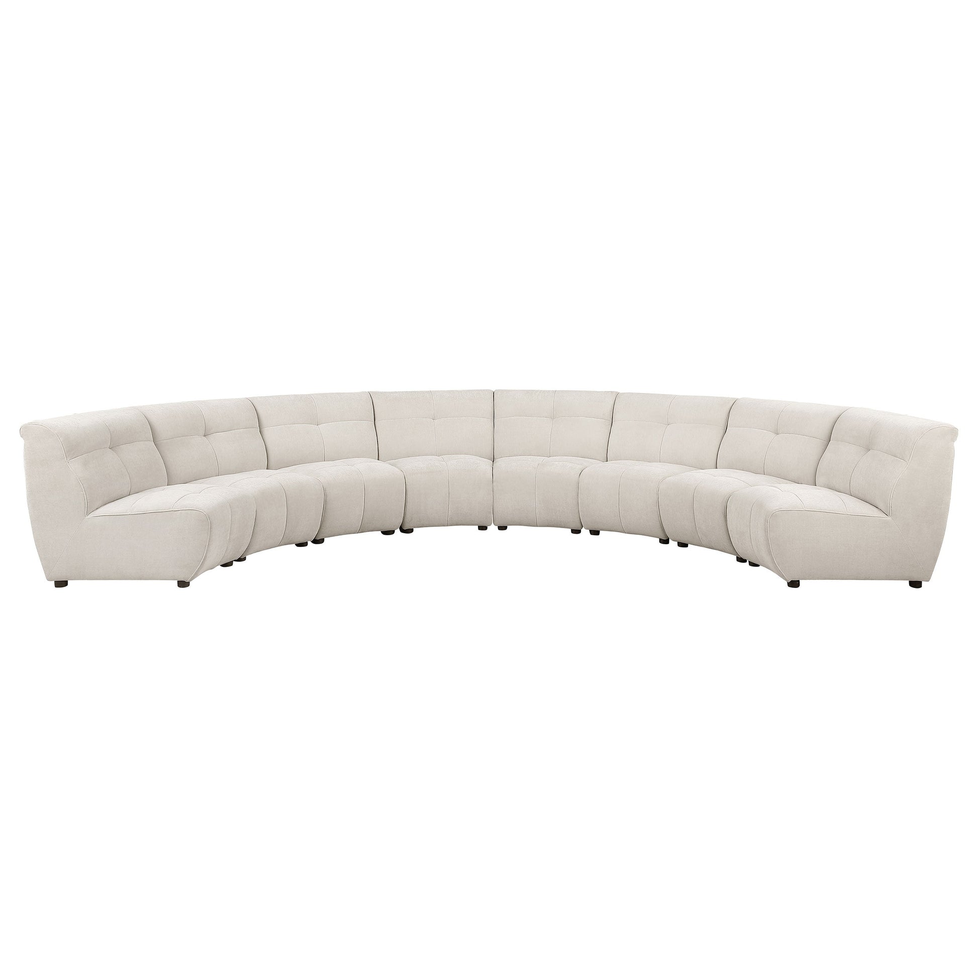 Make a living room or media room the favorite choice for guests and family with a five-piece sectional sofa with minimalism and sophistication woven into its streamlined design. The sectional sofa cuts to the chase with an ultra-comfortable seating experience and subtly rounded profile, perfect for socializing. Durable ivory fabric is soft and inspiring, lending a versatile element to match or coordinate with surrounding décor. This sectional aligns eight armless pieces for a customized configuration and features contemporary design elements with plump, foam-filled framing and decorative tufting adding dimensionality and classic style. A focal point in any space, the sectional sofa accommodates several visitors and adds a low-key, easy motif.