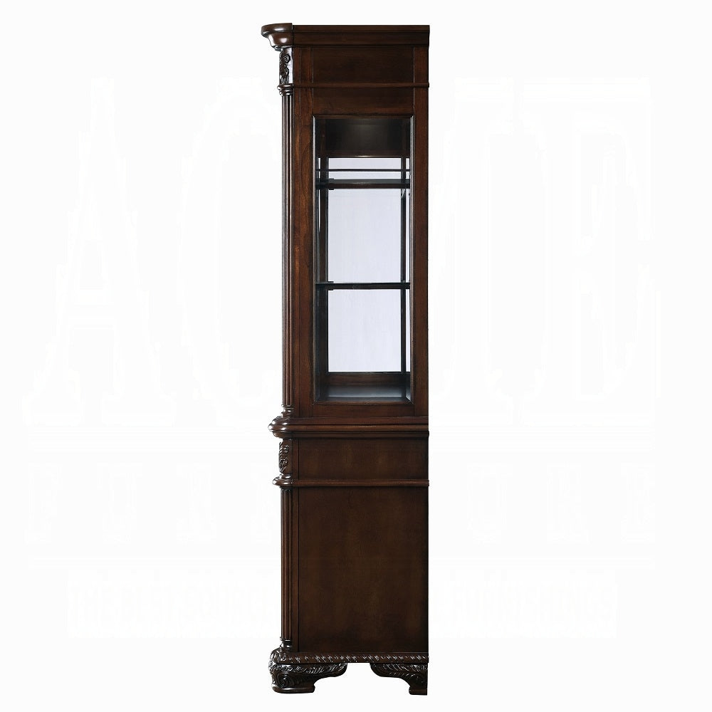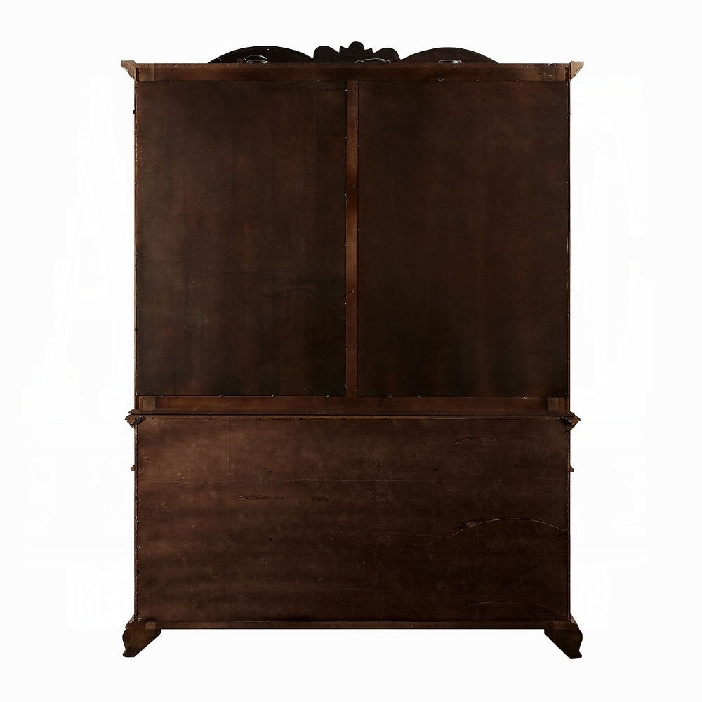 The Chateau De Ville hutch and buffet offers you plenty of space for all your fine dining accessories from napkin rings to serving platters. The top cabinet is accessed via two tall, arched doors and is outfitted with clear glass panels on the front and sides that allow you to clearly see the contents. Two single-door cabinets are built into the base of the unit, complemented by six pull-out drawers. The frame is built from solid hardwood with molded borders and carved side pillars. A floral medallion crowns the double-arched top.