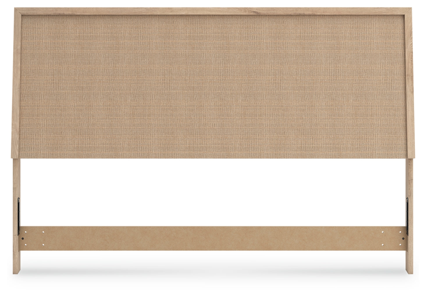 - Headboard panel with textured beige finish that replicates the look of cane
