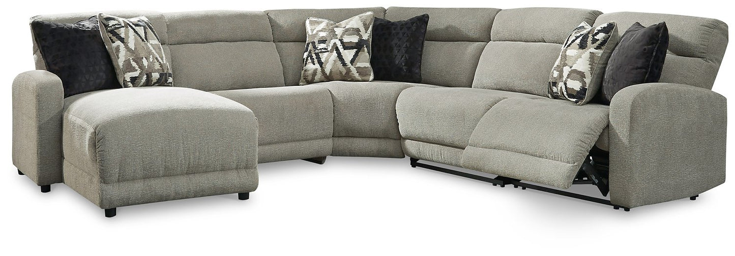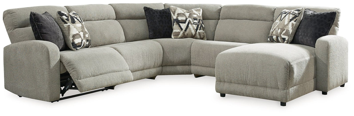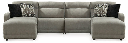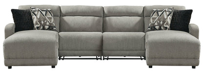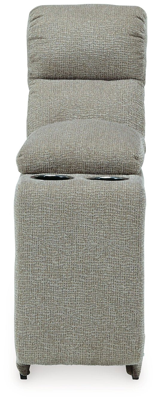 Delightfully modern. Exceptionally comfortable. When it comes to modular furniture with easy-elegant appeal, it’s hard to beat this power reclining sectional. Wrapped in a decadently plush stone-tone fabric for neutral versatility, this chic sectional is dressed to impress with a clean-lined divided back, curved track arms and a low-profile back for a relaxed, contemporary aesthetic.| Full Dimension | 108W x 65D x 39H |