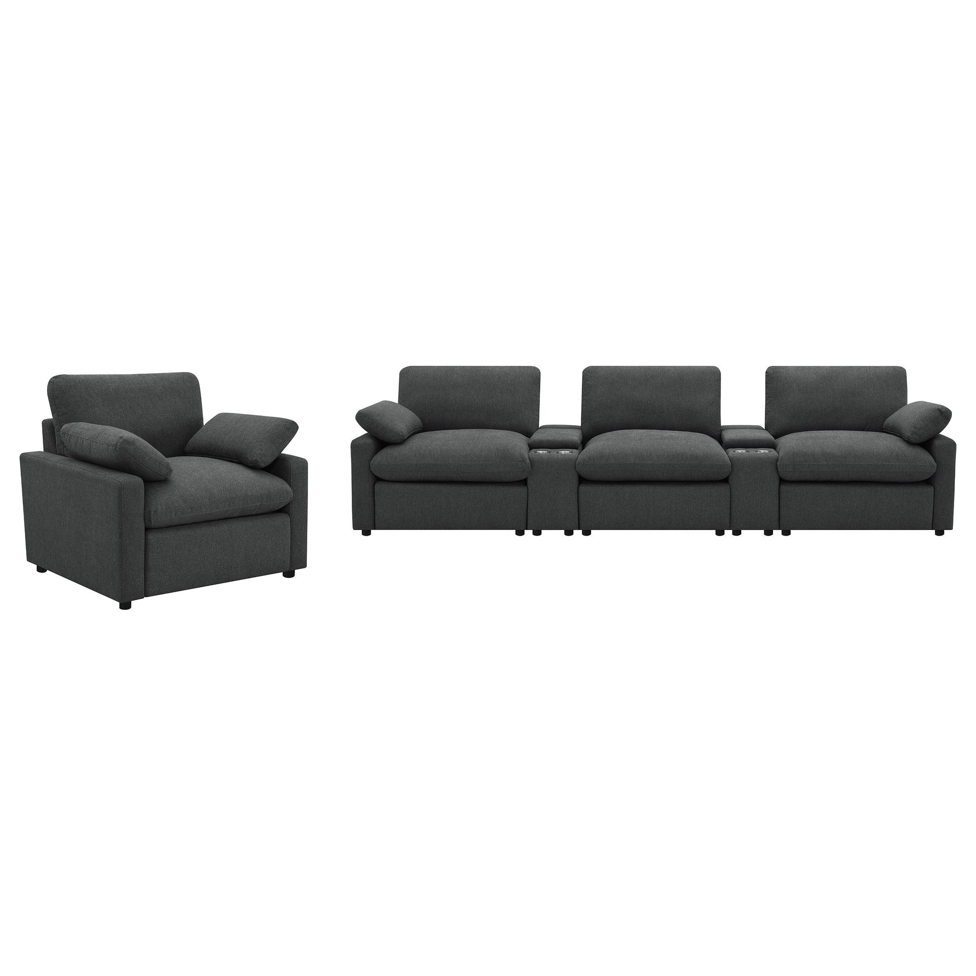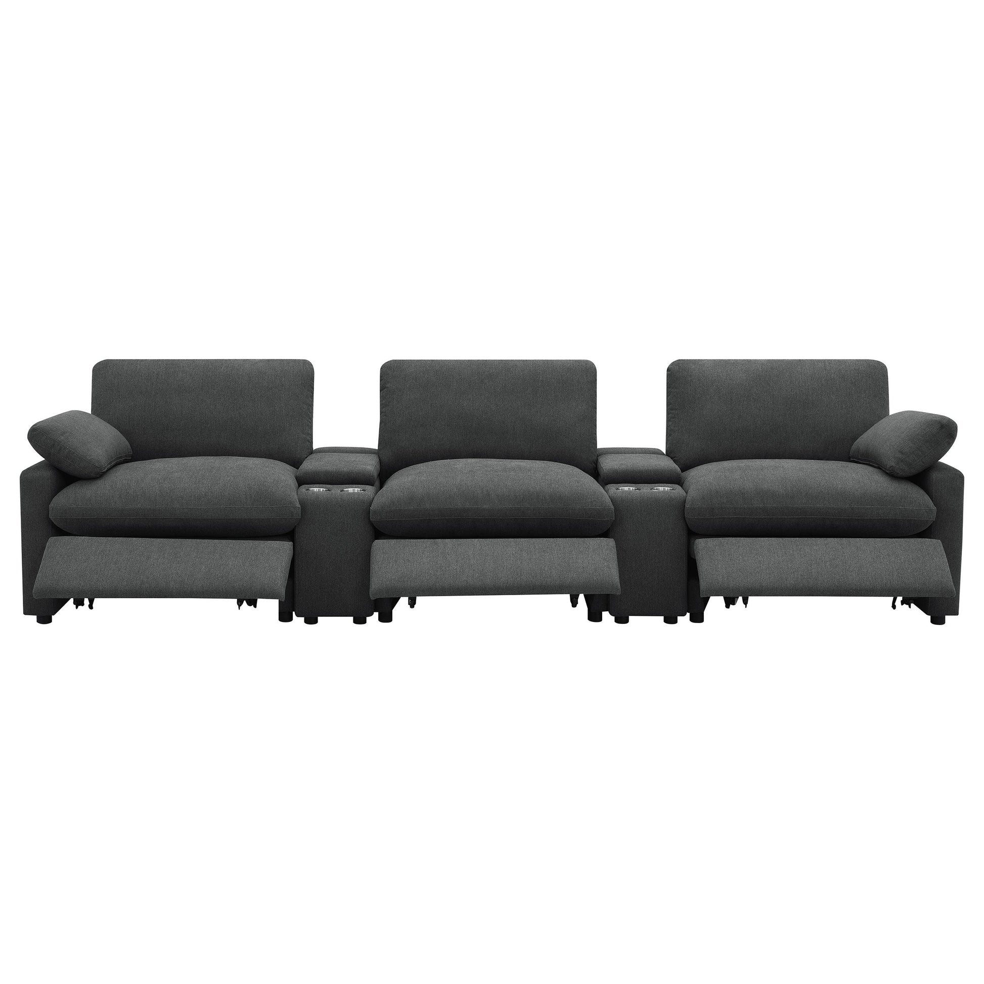 This three-seat home theater seating set combines modern convenience with plush comfort. Each power recliner offers smooth adjustability, while two center consoles feature lift-top storage and dual stainless steel cup holders. Upholstered in soft fabric, the generously padded cushions and pillow-top armrests enhance relaxation. Built for durability and long-lasting support, this seating arrangement is perfect for creating a cozy entertainment space.