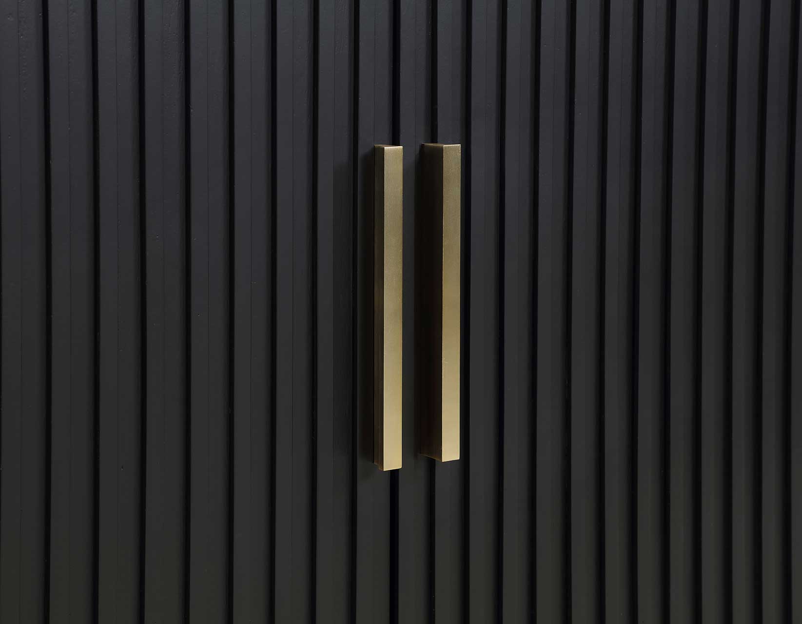 Experience the Colvin Black Server’s modern allure with gently rounded, reeded front doors, emanating elegance. This piece blends old Hollywood glamour with generous storage and European concealed hinges for a seamless aesthetic. Two adjustable shelves within offer practicality, while satin brass hardware accents add a touch of sophistication. Revel in its romantic charm while effortlessly concealing dining essentials.