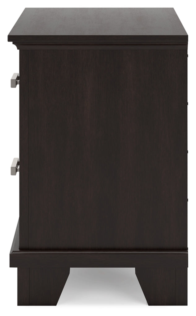 Feast your eyes on this richly versatile nightstand. Its traditional-inspired dark brown finish effortlessly blends with contemporary bright nickel-tone pulls to create a stunning look that's not too stuffy or too trendy. Spacious drawers offer plenty of room to tuck away your bedside must-haves.
