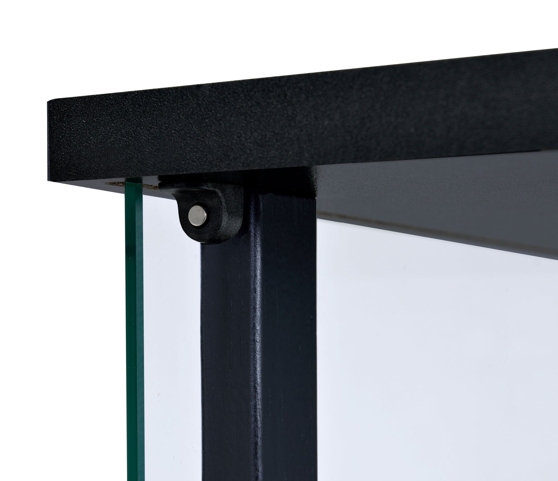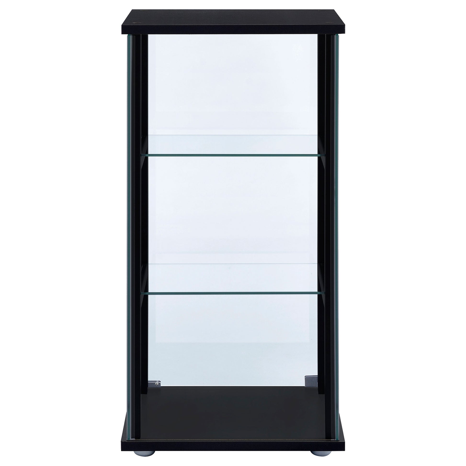 A modern version of a true classic makes a fabulous addition to a transitional space. With linear styling and a fresh look, this curio cabinet offers a perfect venue for showcasing treasured decor. Bold black tops a simple frame, top, and base. Tempered glass shelves create transparent space for display. Access its interior easily with push-to-open doors.