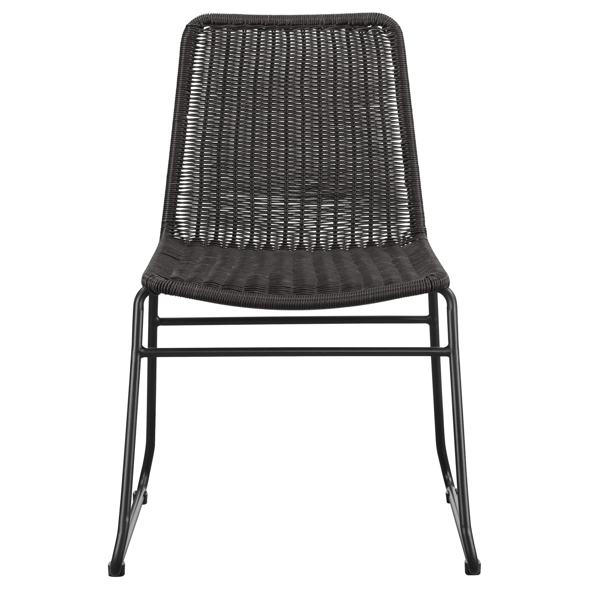Place this transitional dining chair in a space for a hint of texture. Designed with a brown handwoven faux rattan across the seat, this charming chair offers a natural, boho-inspired vibe. Mounted on a black metal frame that offers all the support one needs, this lovely dining chair also offers vintage vibes with a flared base that lends an open, airy look. The sandy black slim frame also creates bold lines. Place this rattan-wrapped dining chair at a mid-century style dining table or allow it to grace a home office for extra guest seating.